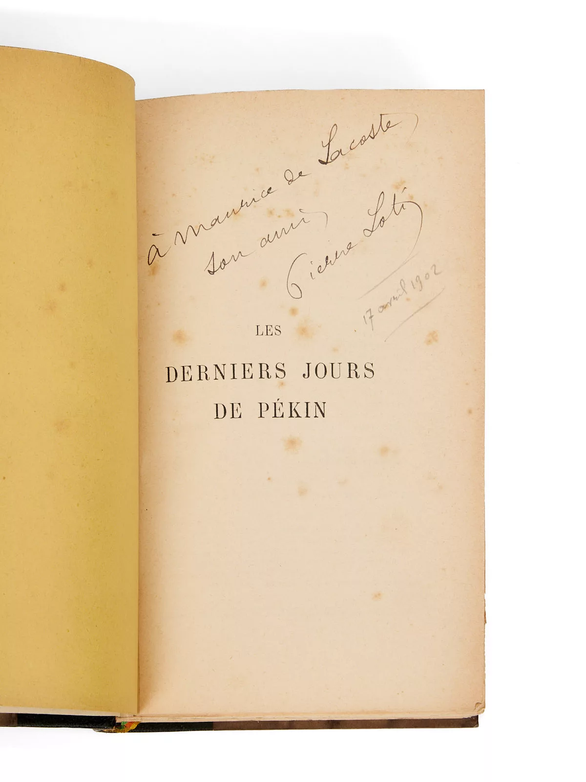 Intéressant exemplaire, offert à un proche et fidèle camarade de Navale, Maurice de Lacoste. Natif de Metz en 1864, ce dernier entre à l’école navale en 1882, quinze ans après Loti. Aspirant de 1ere classe en octobre 1885, il est tout d’abord affecté dans la division navale d’Extrême-Orient. C’est lors de ces premières traversées qu’il rencontre Pierre Loti, qui navigue dans ces mers depuis la même année à bord du Mytho, l’un des onze transports officiels des forces navales en Extrême-Orient. C’est sur ce navire, durant un mois un mois de traversée, que Loti a rédigé en partie le manuscrit de Pêcheur d’Islande.