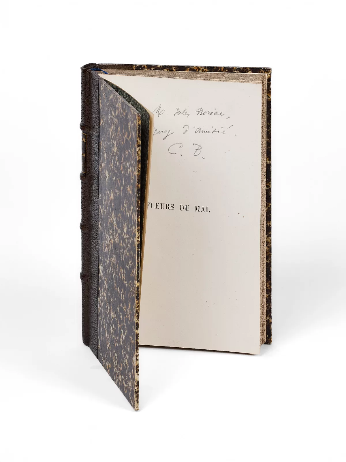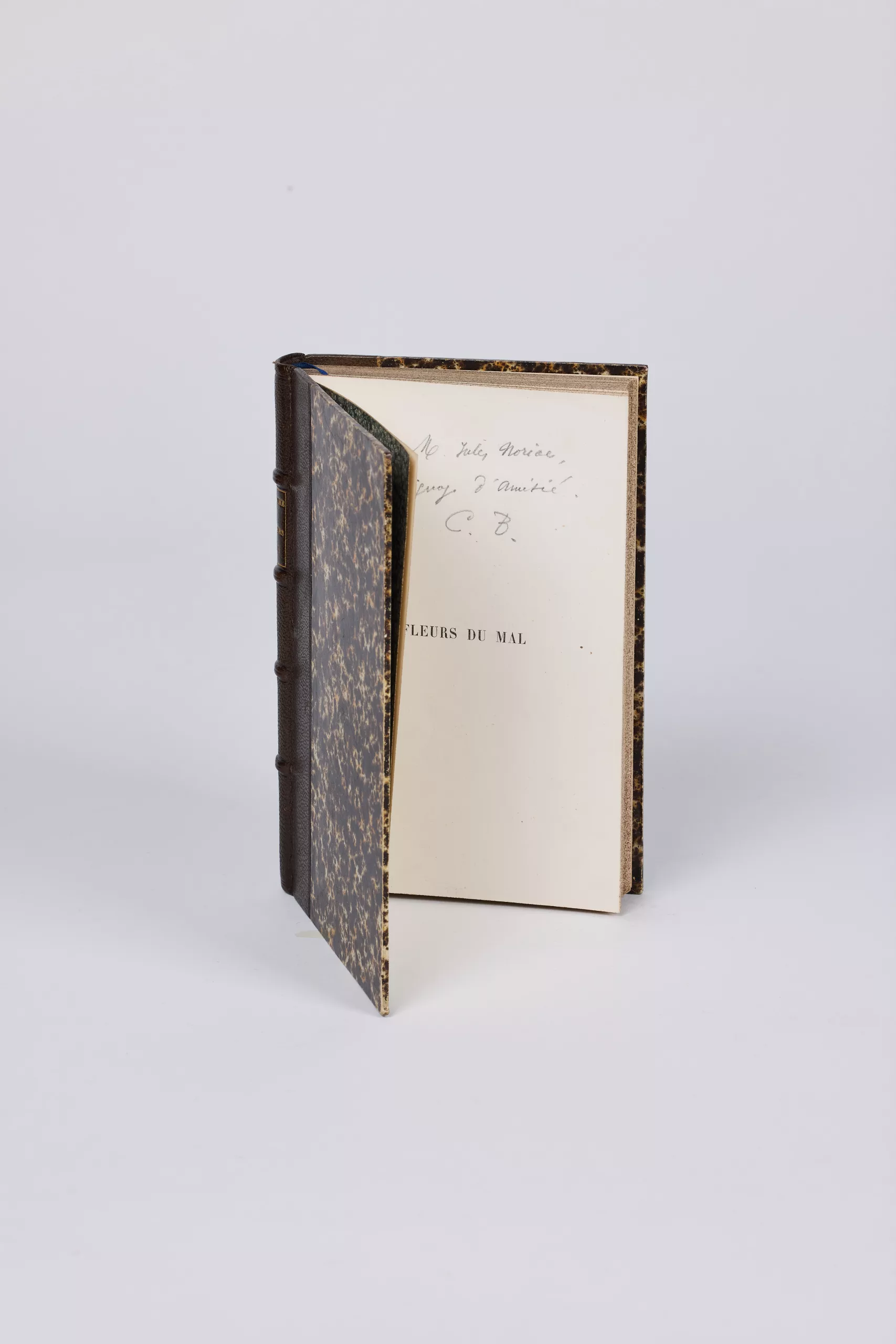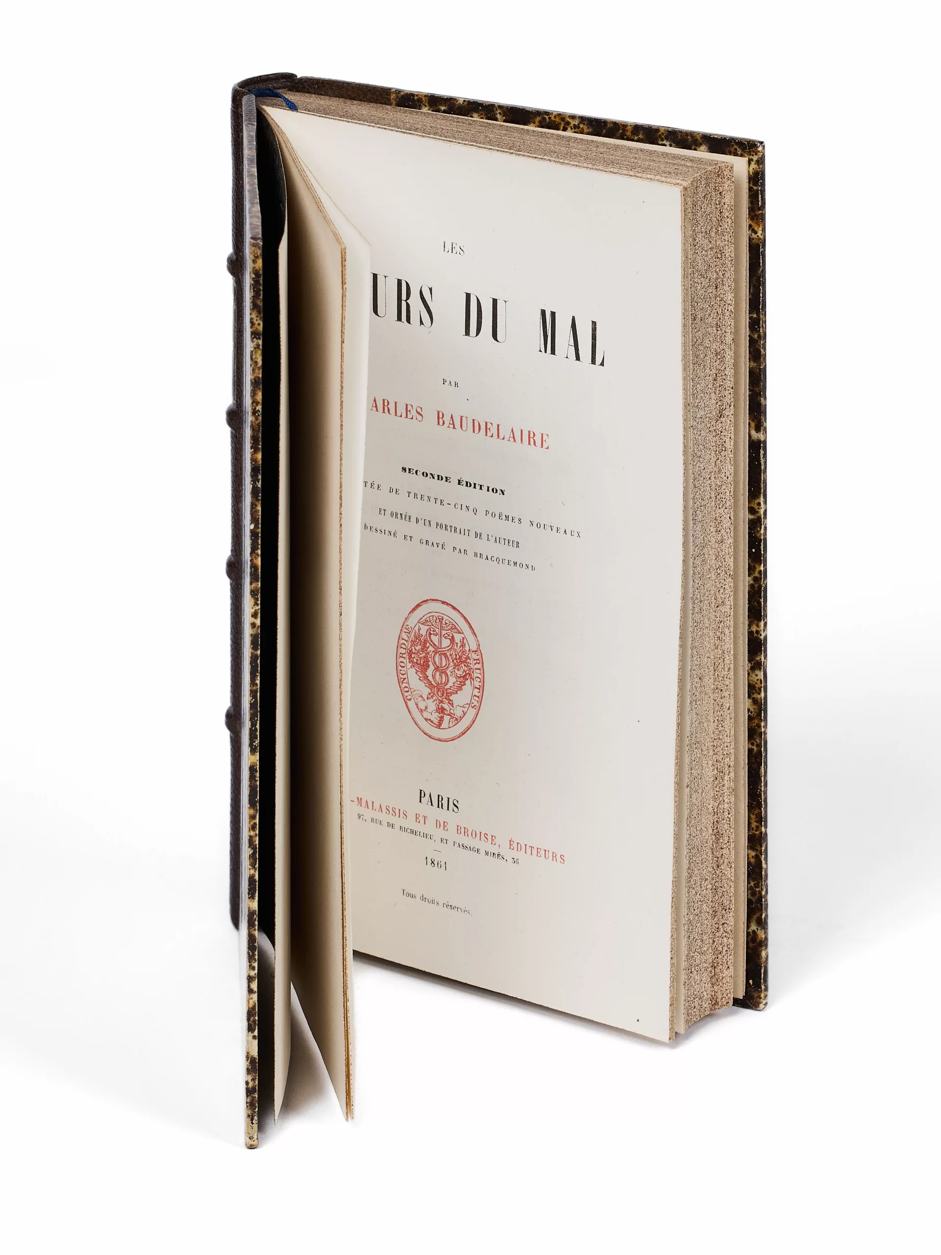 Deuxième édition en grande partie originale.Elle est augmentée de 35 nouvelles pièces qui ne figuraient pas dans l'édition de 1857.L'édition de référence, donnée par Baudelaire lui-même comme l'édition complète et définitive du plus fameux recueil de poésies du XIXe siècle.Bien complet du portrait de Baudelaire par Bracquemond, souvent manquant ; « quand il existe, c’est avec la plus grande fantaisie : variété des papiers et diversité des états […] » (Oberlé). Envoi signé (à la mine de plomb) : « À M. Jules Noriac, Témoignage d'amitié. C.B. » Note au crayon p. 180.