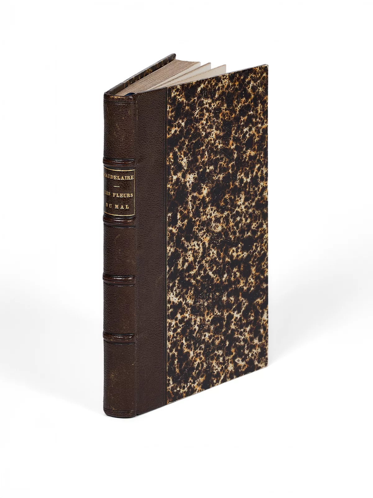 Sur les 28 exemplaires que nous avons recensés, 8 seulement sont en reliure d’époque. La nôtre, en demi-maroquin brun, non signée, est de bonne facture. Elle a probablement été commandée par Jules Noirac, dès la parution du volume et son envoi par Baudelaire. C’est avec certitude sa première -et seule – reliure. Les feuillets intérieurs sont très frais, avec un corps d’ouvrage solidement établi.