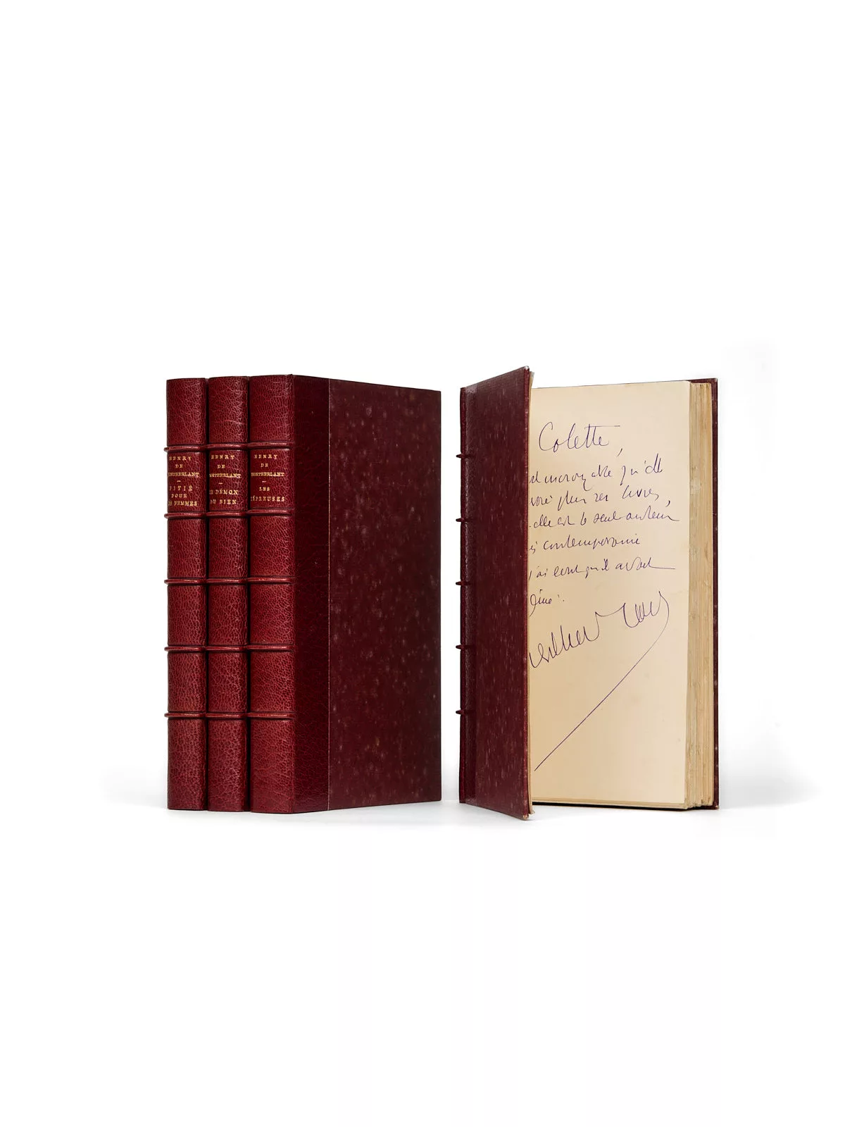 « À Colette dont il est incroyable qu'elle ne m'envoie plus ses livres, alors qu'elle est le seul auteur français contemporain dont j'ai écrit qu'il avait du génie, Henri de Montherlant » ;