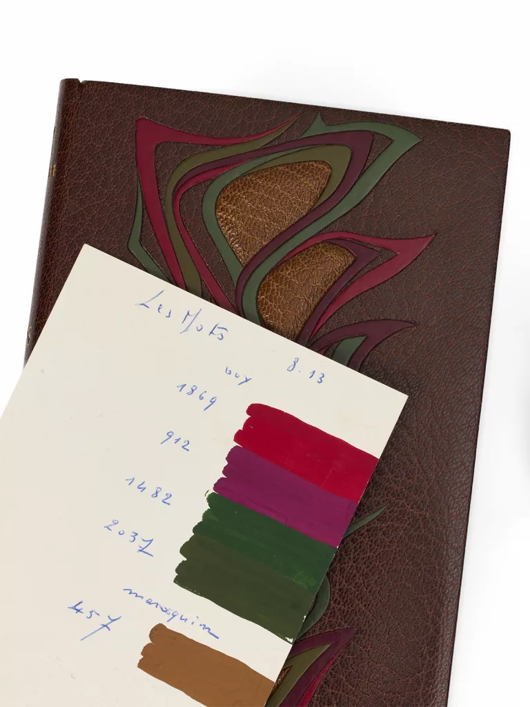 L’exemplaire contient par ailleurs le nuancier original de Paul Bonet qui lui a servi à la composition de cette reliure – la seule qu’il réalisa sur le papier de tête des Mots.