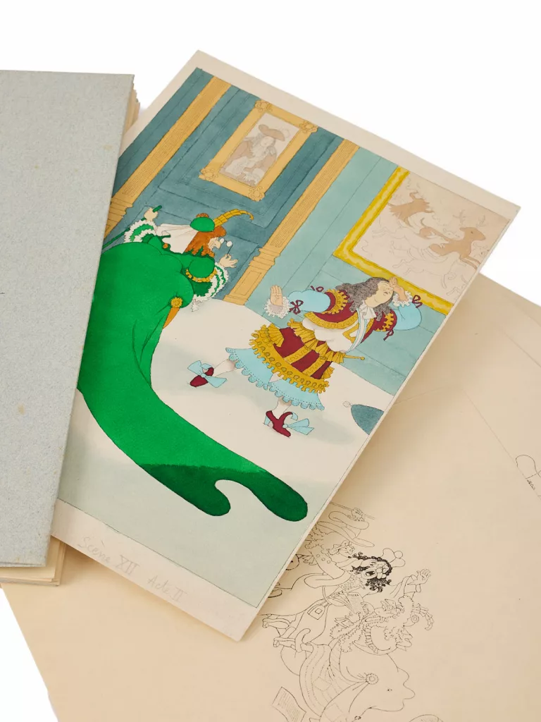 Il est accompagné d'un magnifique dessin original (encre de chine et couleurs, signé), pleine page, reproduit p. 97 (Acte II, scène XII).