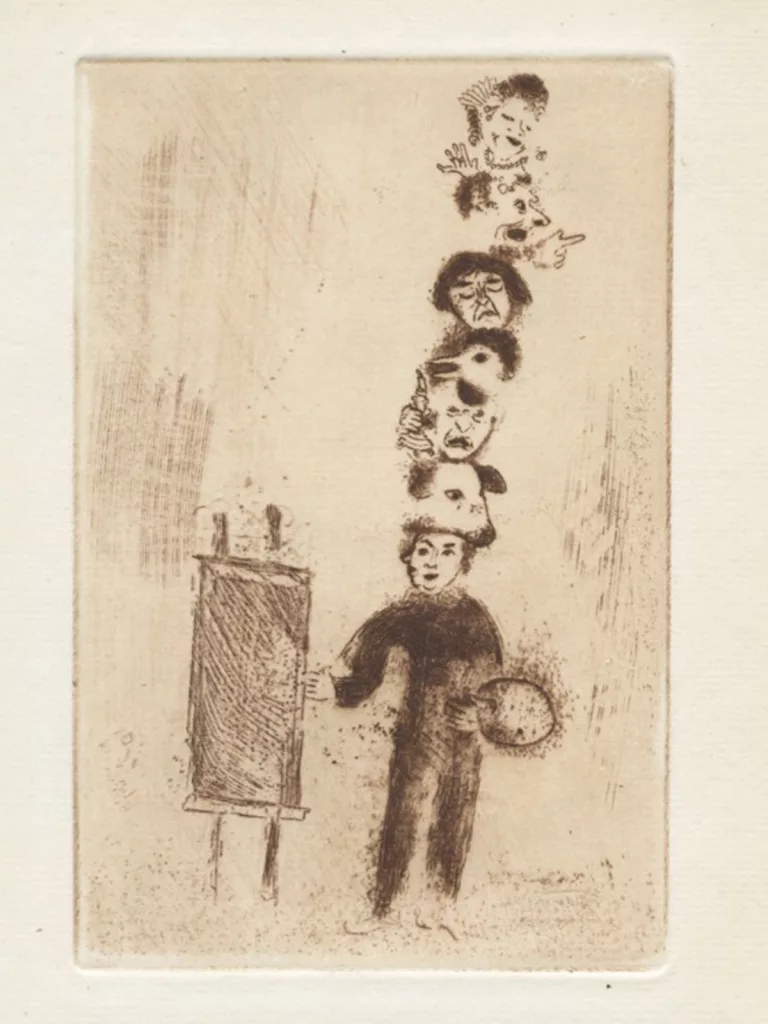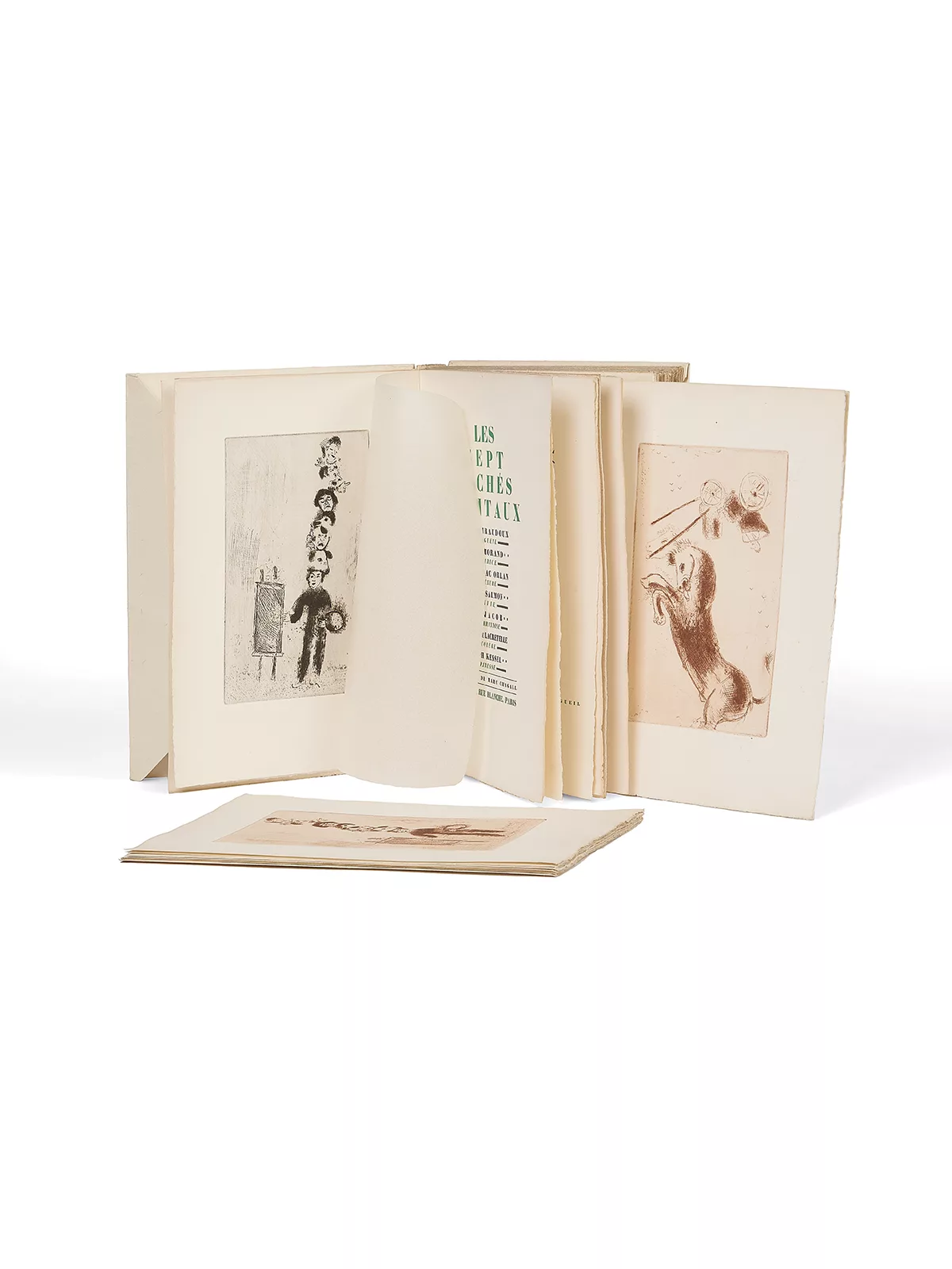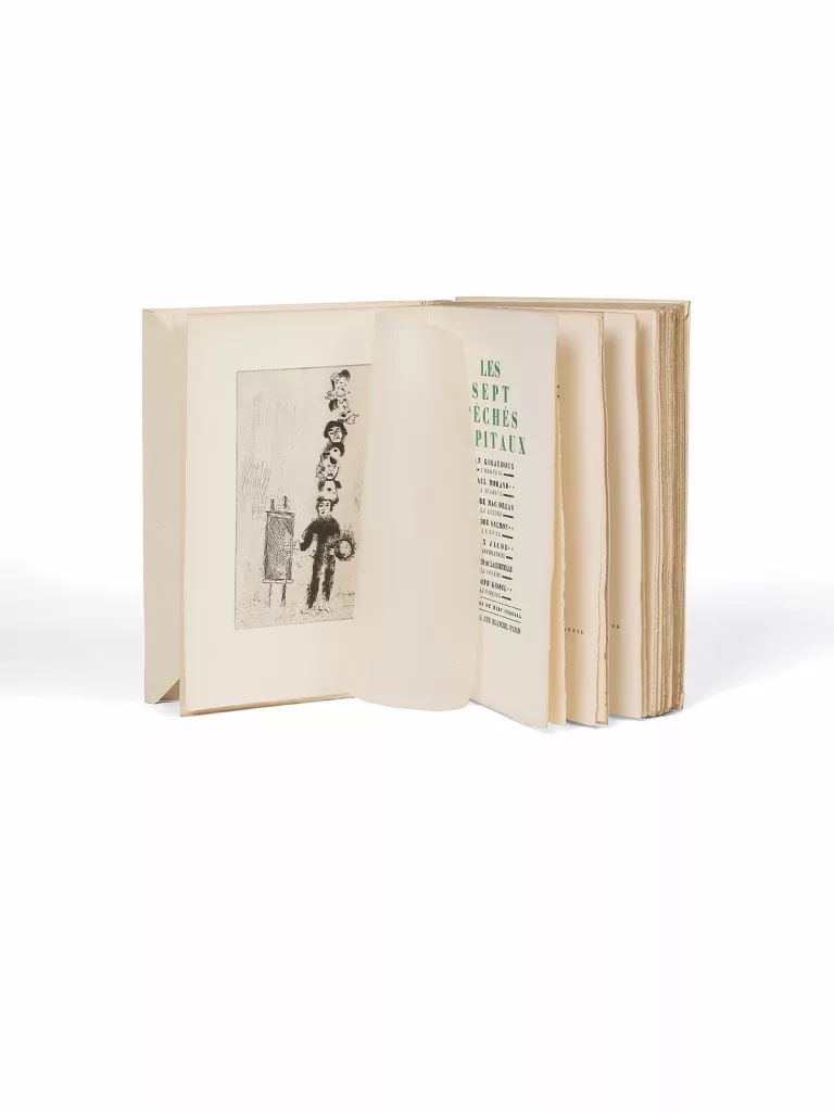 Un des livres importants de la période parisienne de Chagall, qui illustre ici sept nouvelles, chacune écrite par un auteur différent : Jean Giraudoux, L’Orgueil, Paul Morand, L’Avarice, Pierre Mac Orlan, La Luxure, André Salmon, L’Envie, Max Jacob, La Gourmandise, Jacques de Lacretelle, La Colère et Joseph Kessel, La Paresse. Chagall compose pour elles quinze eaux-fortes qui ne se contentent pas d’illustrer le propos moral mais recomposent le cycle des vices dans son propre vocabulaire esthétique. Une réussite.