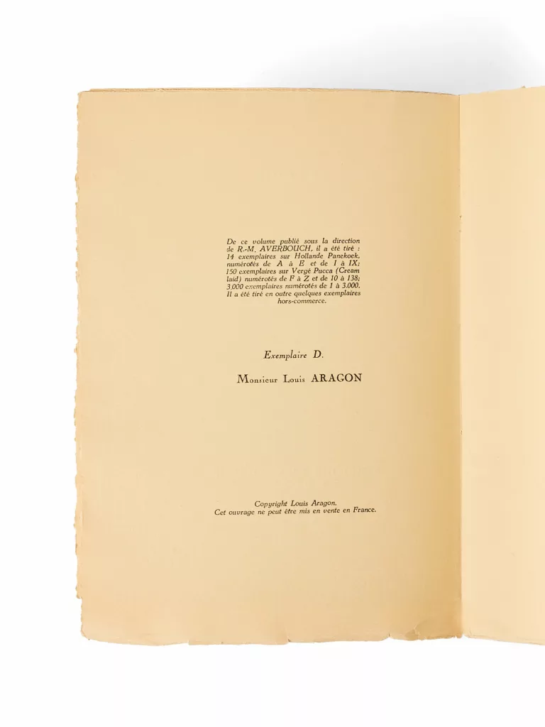 Un des 14 premiers exemplaires sur vergé de Hollande teinté, celui-ci un des cinq premiers hors commerce (exemplaire D), nominatif pour Louis Aragon.