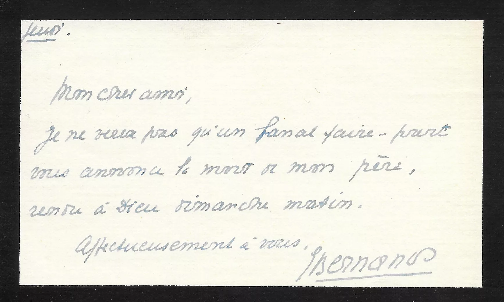 « Jeudi. Mon cher ami, Je ne veux pas qu’un banal faire-part vous annonce la mort de mon père, rendu à Dieu dimanche matin. Affectueusement à vous. G. Bernnaos ».