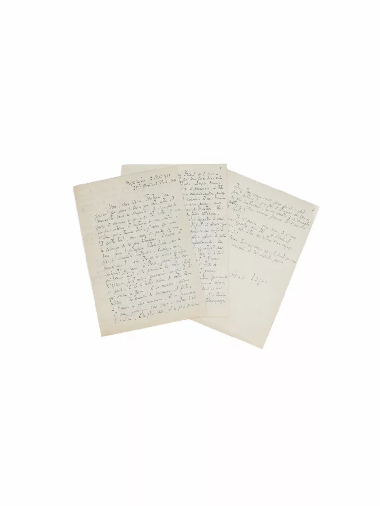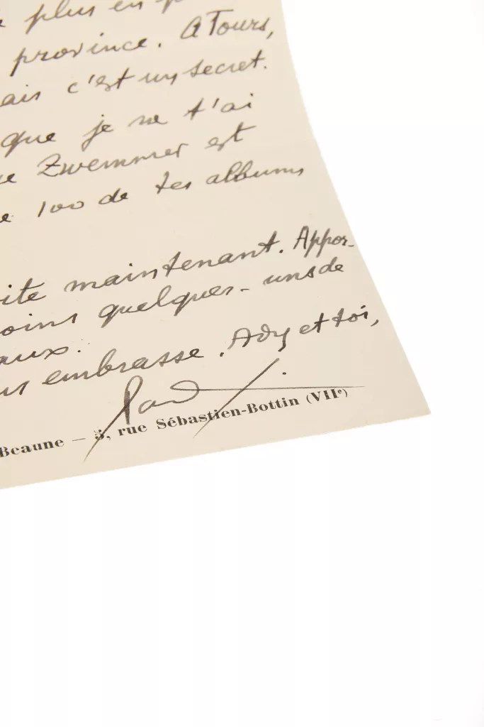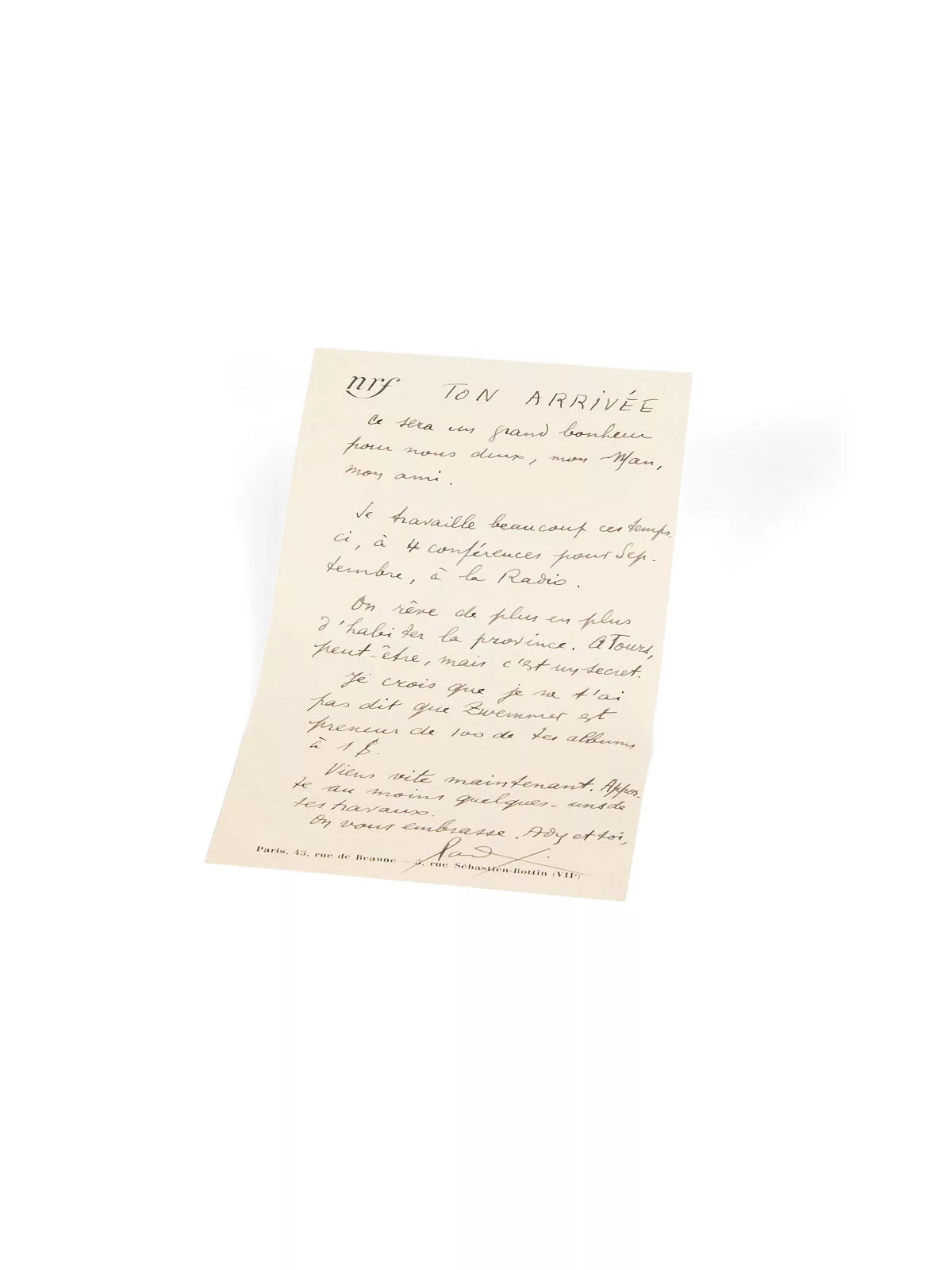 « TON ARRIVÉE. Ce sera un grand bonheur pour nous deux, mon Man, mon ami. Je travaille beaucoup ces temps-ci, à 4 conférences pour Septembre, à la Radio. On rêve de plus en plus d’habiter la Province. À Tours, peut-être, mais c’est un secret. Je crois que je n’ai pas dit que Zwemmer [Anton Zwemmer, libraire et éditeur néerlandais] est preneur de 100 de tes albums à 1$. Viens vite maintenant. Apporte au moins quelques uns de tes travaux. On vous embrasse, Ady et toi. Paul Eluard ».