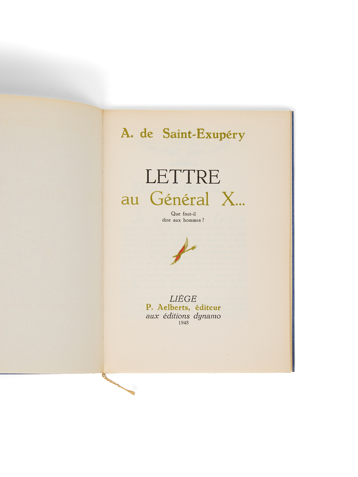 « Ce témoignage exceptionnel et capital constitue le testament spirituel de l’écrivain disparu » : ce texte rare sera réédité l’année suivante, dans une édition confidentielle tirée à seulement 8 exemplaires, par l’Imprimerie générale du Sud-Ouest, pour le compte d’un bibliophile. Écrite très probablement en juin 1943 alors que Saint-Exupéry effectue ses vols de formation sur le Lockheed P-38 Lightning, cette fameuse lettre fut retrouvée dans ses affaires personnelles après sa disparition (31 juillet 1944). Contrairement à ce qu’on peut lire ici ou là, cette lettre n’est pas le dernier texte écrit par Saint-Exupéry, pas plus qu’elle n’est datée de juillet 1944 ; il apparaît donc comme abusif de la considérer comme son « testament ». Elle n’en demeure pas moins une lettre mystérieuse dont le destinataire reste inconnu – la recherche penche vers le général Béthourd, davantage que pour le général Chambe ; elle est demeurée intacte dans ses notes de travail retrouvées à Borgo, sans avoir été ni datée, ni envoyée.