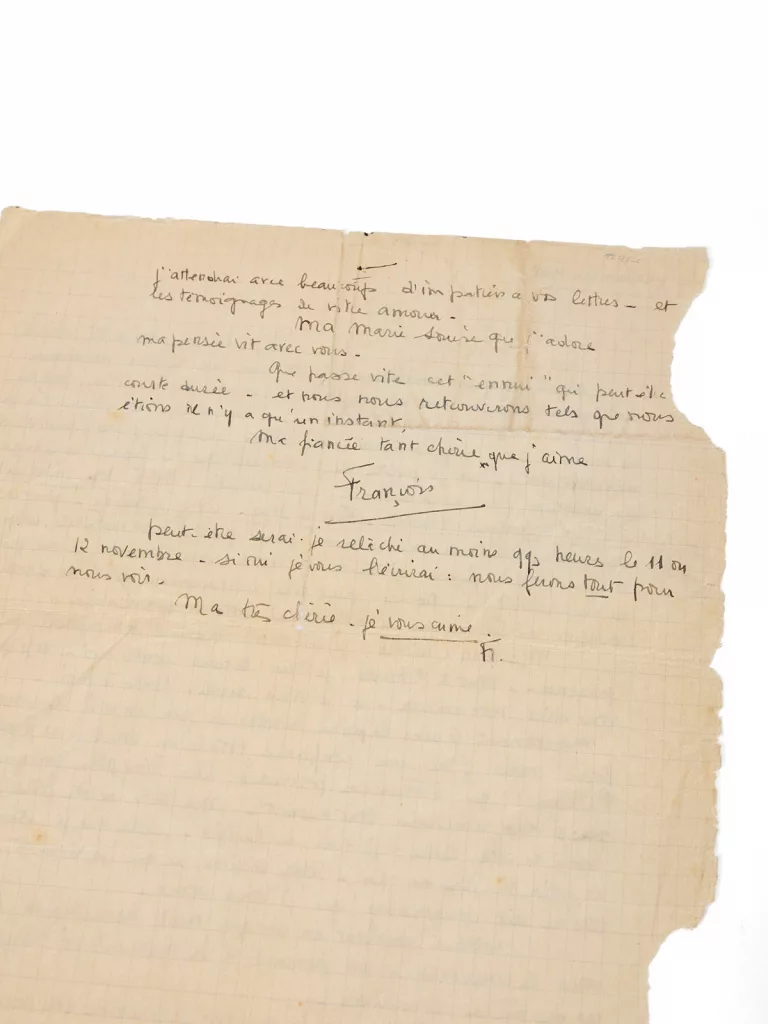 Il lui écrit aussitôt – c’est la toute première lettre qu’il rédige depuis son incorporation – « sur un papier aimablement prêté par un de mes nouveaux collèges (déjà en veine de confessions)… Je suis encore dans l’atmosphère de votre présence. Tout à l’heure je vous tenais contre moi, et je pouvais vous dire mon amour […] maintenant je sens la peine de vous savoir loin […] inutiles de revenir sur vos promesses : elles valent pour toute la vie. J’attendrai avec impatience vos lettres – et les témoignages de votre amour […] Peut-être serai-je relâché au moins quelques heures le 11 ou le 12 novembre. Si oui je vous écrirai : nous ferons tout pour nous voir. Ma très chérie, je vous aime. F. »