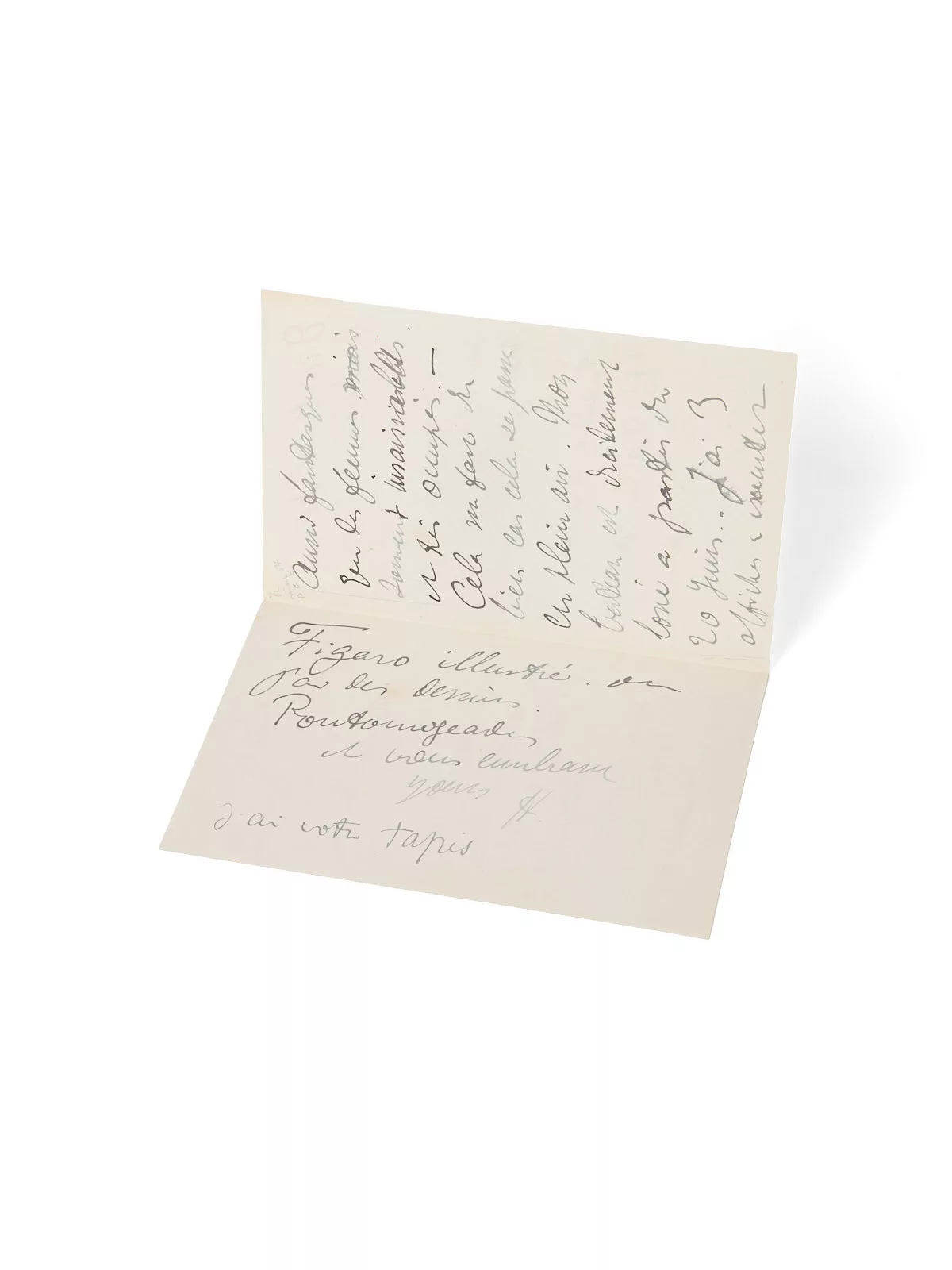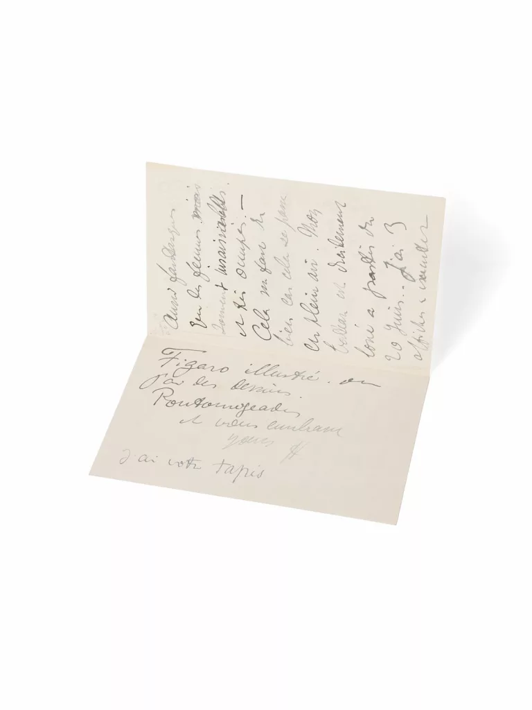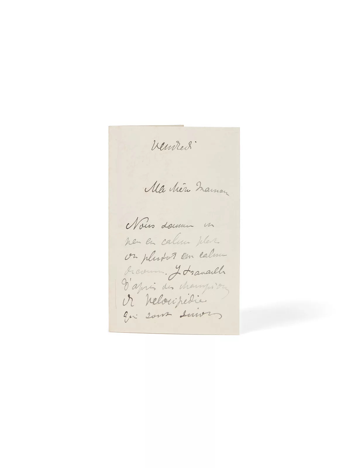 Ma chère maman, nous sommes un peu en calme plat ou plutôt en calme de course. Je travaille d'après des champions de vélocipédie qui sont sinon aussi fantasques que des femmes mais [barré] souvent insaisissables et très occupés. Cela me fait du bien car cela se passe en plein air. Mon bateau est décidément loué à partir du 20 juin... J'ai 3 affiches à exécuter d'ici là et par la chaleur qu'il va faire ce sera tout juste amusant. Je n'ai pas pu repincer encore Guibert [son ami le riche Maurice Guibert, photographe amateur qui laissa plusieurs portraits fameux de Toulouse-Lautrec, lequel fit un portrait de lui] mais j'ai d'autres camarades pour aller à Anvers. - Quan[t] à Arcachon... Pas d'autres nouvelles en vue. Je vous ferai envoyer le Figaro illustré, où j'ai des dessins. Poutogeades et vous embrasse. Yours... H. (…) ».