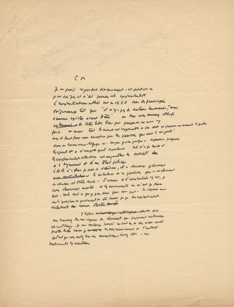 L’H[omme] R[évolté] n’a pas créé de schisme, il a dénoncé poliment ces contradictions le nihilisme de ces positions qui se réclament de [l’histoire ?] et d’elle seule. L’avenir de l’existentialistes y est, je crois clairement montré et les événements ne m’ont pas donné tort. Voilà tout ce que je puis dire pour ma part.