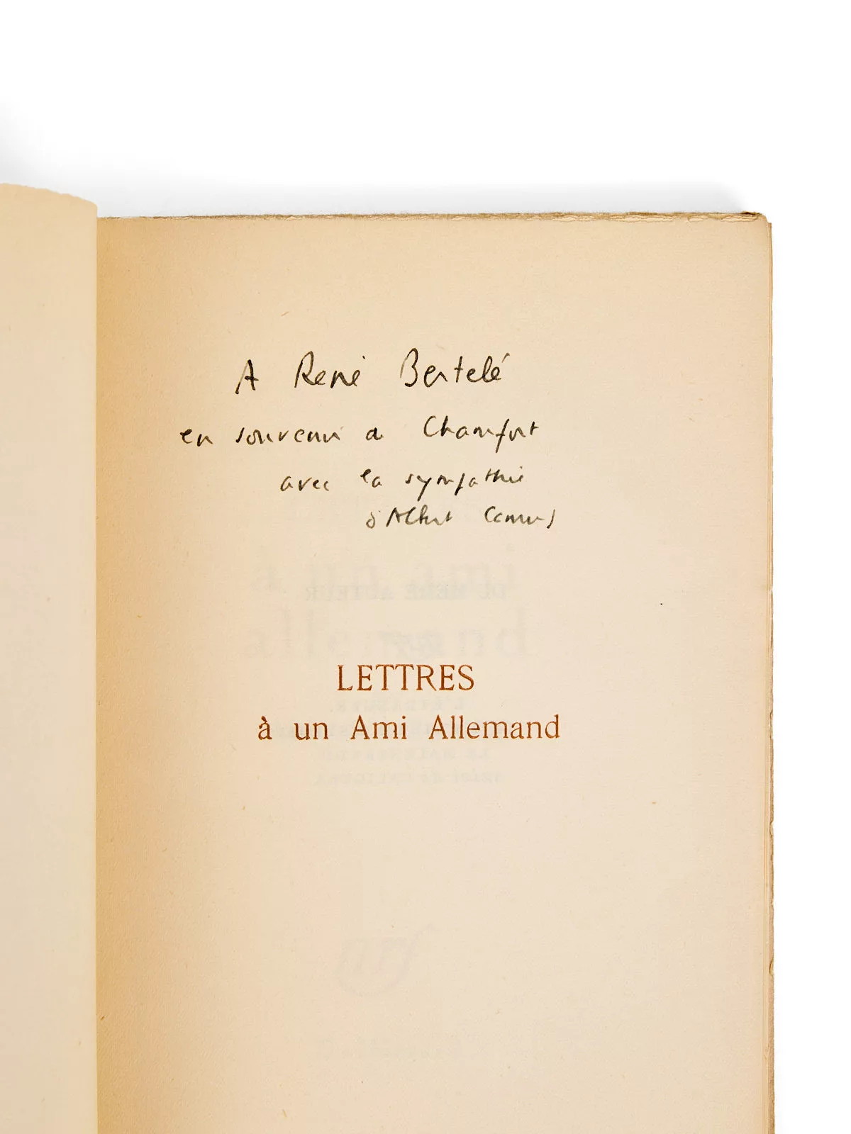Envoi signé : « À René Bertelé, en souvenir de Chamfort, avec la sympathie d'Albert Camus ».