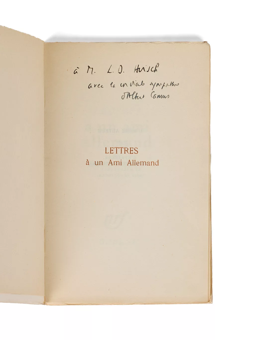 Édition originale. Un des 2250 exemplaires sur alfa Navarre, celui-ci hors commerce (H.C. n° 2213). Envoi signé : « à M. L. D. Hirsch avec la cordiale sympathie d’Albert Camus ». Bandeau éditeur conservé.