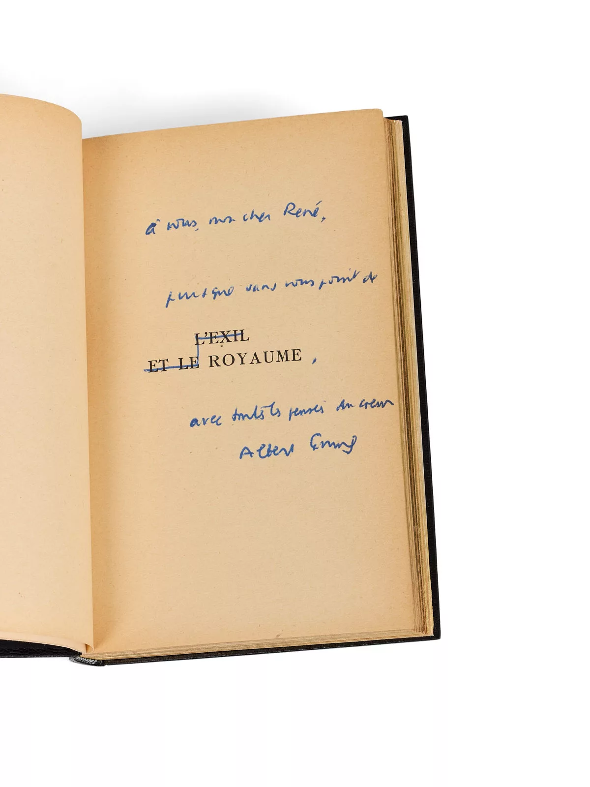 Édition originale. Un des exemplaires du service de presse. Envoi signé : « à vous, mon cher René [Char], puisque sans vous point de [ROYAUME], avec toutes les pensées du cœur. Albert Camus ».