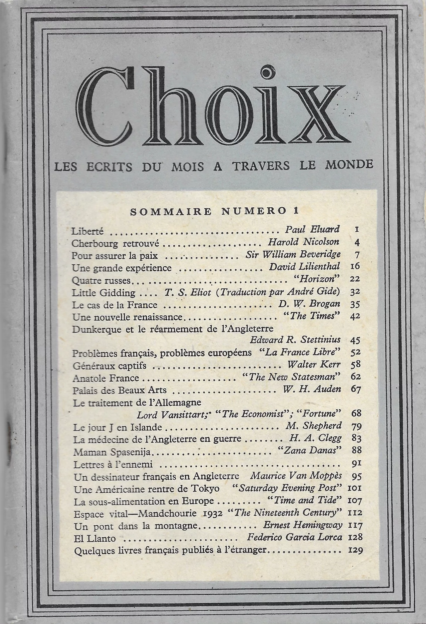 « Liberté », qui paraît pour la première fois sous ce titre dans une revue publiée hors de France, en l’occurrence à Londres, où vient d’être publiée en mai une édition bilingue de Poésie et Vérité 1942 contenant le poème sous ce titre, ouvre cette nouvelle revue qui se veut un Reader’s Digest « pour les services d’information alliés » à destination du public français. La dernière page recense sous la rubrique « publié à l’étranger, 1940-1944 », des livres français principalement par La France Libre à Londres et les Éditions Maison Française, à New York. On y retrouve Aragon, Vercors, Saint-Exupéry, Bernanos, Maritain…