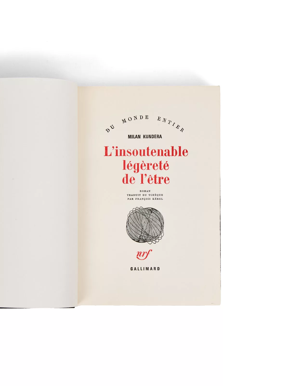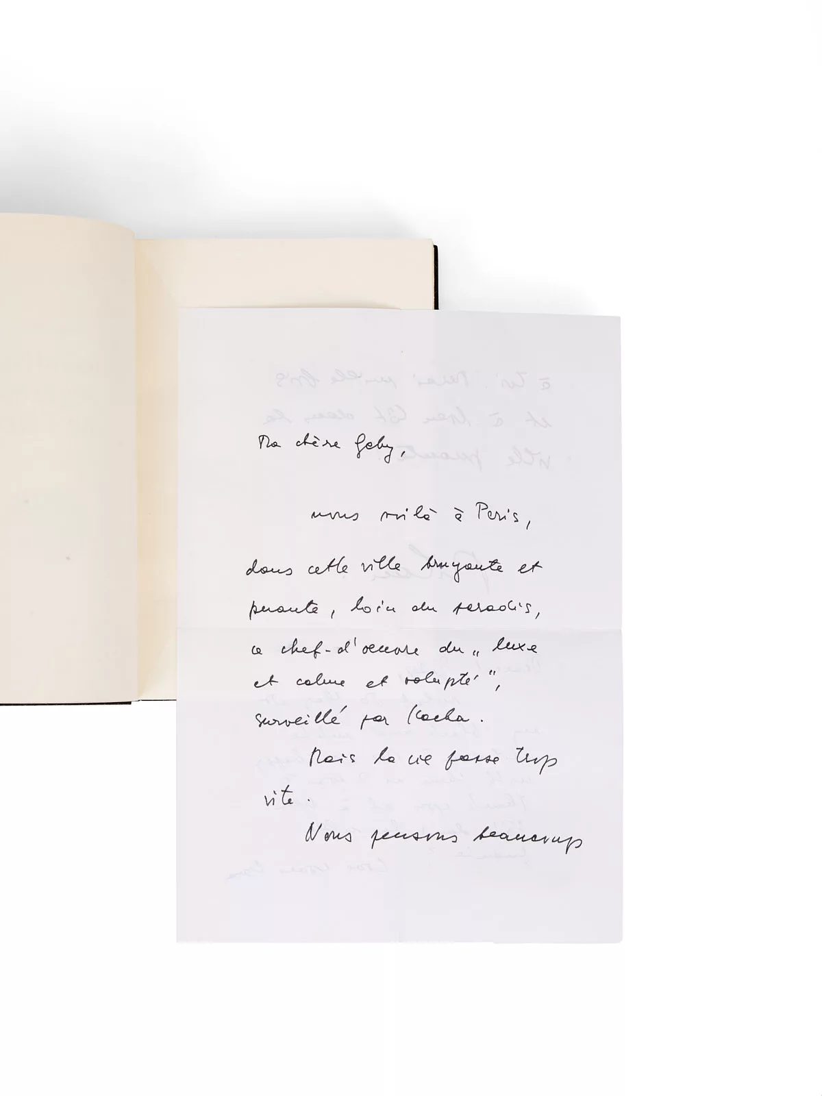 Jointe, une lettre autographe signée de Milan et Véra Kundera, adressée à une certaine « Gaby », en appelant ici encore à Kafka : le couple l’informe de leur arrivée à Paris, « cette ville bruyante et puante, loin du paradis, ce chef-d’oeuvre du ‘luxe et calme et volupté’ surveillé par Kafka. Mais la vie passe trop vite », regrette Kundera. Suit un mot (en anglais) de Vera «What do they do my black and white children? Are u happy with them as I was ? Thank you et à bientôt dans la ville puante ? Love, Yours, Vera».