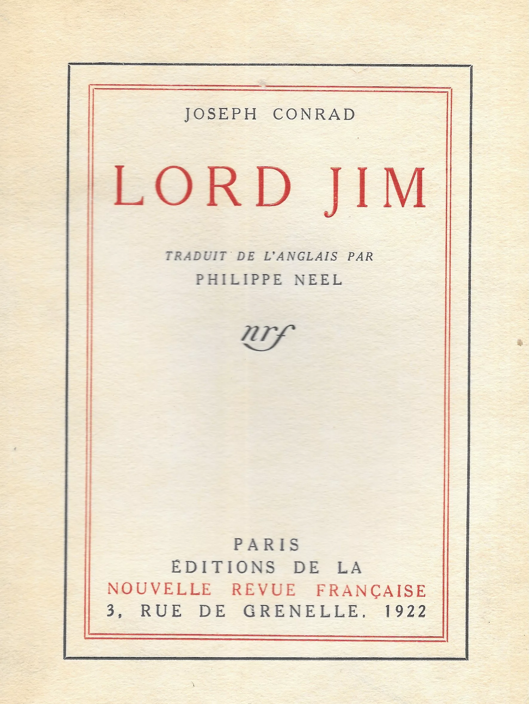 Publié en feuilleton d’octobre 1899 à novembre 1900 dans le périodique Blackwood’s Magazine, il est édité en un volume – dans une version révisée à la fin de cette même année. La traduction française n’intervient que plus de 20 ans plus tard, lorsque Gallimard décide enfin d’honorer l’auteur en publiant la quasi-totalité de son oeuvre, sous l’impulsion d’André Gide, qui avait traduit Typhon dès 1918. Lord Jim sera la second volume ; suivront ensuite Jeunesse – Coeur des ténèbres, Nostromo, Les frères de la côté, au rythme d’un volume tous les deux ans.