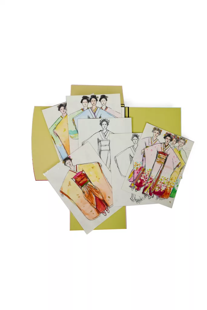 Si Kenzo a produit au fil de sa vie des milliers de croquis et esquisses (près de 5 000 selon lui), les dessins aboutis à l’aquarelle sont d’une grande rareté, et plus encore lorsqu’ils concernent ses créations hors du champ de la haute couture.