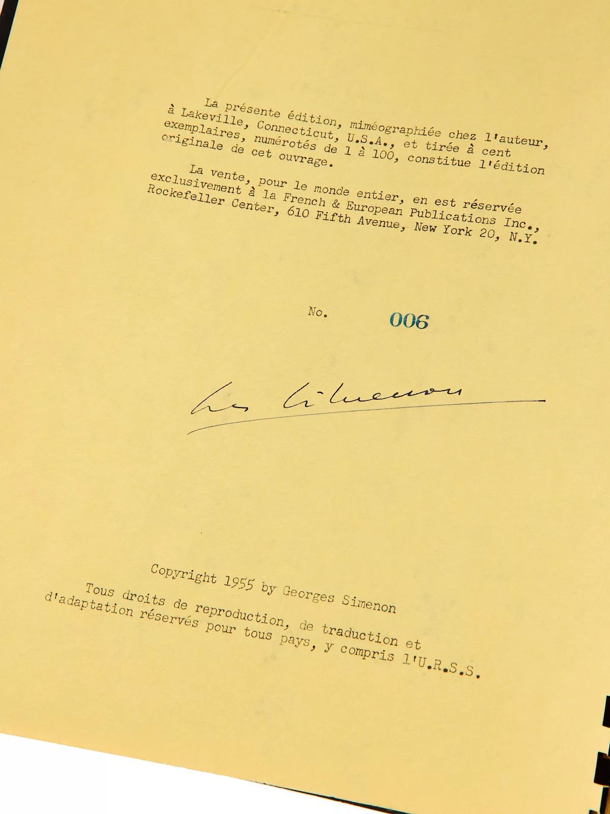 « Peut-on imaginer, interroge Jean-Baptiste Baronian, qu’au cours de cet exil volontaire, il ait eu la nostalgie de ses jeunes années, lorsqu’il dénichait chez les bouquinistes de Liège des perles rares et des éditions princeps ? Est-ce là une des raisons pour lesquelles il a décidé un beau jour de réaliser lui-même […] un tirage spécial à petit nombre de certains de ses romans ? Il est difficile de répondre à ces questions. Des motifs juridiques ont été invoqués, mais ils demeurent invérifiables […]. Il ne devait conserver qu’une partie du tirage, juste de quoi distribuer quelques exemplaires autour de lui et faire plaisir à ses visiteurs. C’est dire si ces originales-là ne circulent guère et si elles sont fort rares sur le marché […]. De là à penser que leur tirage, contrairement à ce qui est mentionné [100 exemplaires] serait fictif et ne se limiterait qu’à une vingtaine d’exemplaires ou que Simenon en aurait détruit une bonne partie… » Sans parler de la fragilité même du support : les stencils utilisés pour de telles éditions miméographiées, sur un papier de grande finesse, ne permettaient qu’un faible tirage avant qu’ils ne soient trop usés. Les différences d’encrage entre les exemplaires le montrent bien et il y a fort à parier que, si le tirage n’a pas dépassé la cinquantaine d’exemplaires tout au plus, c’est pour une raison simplement technique.