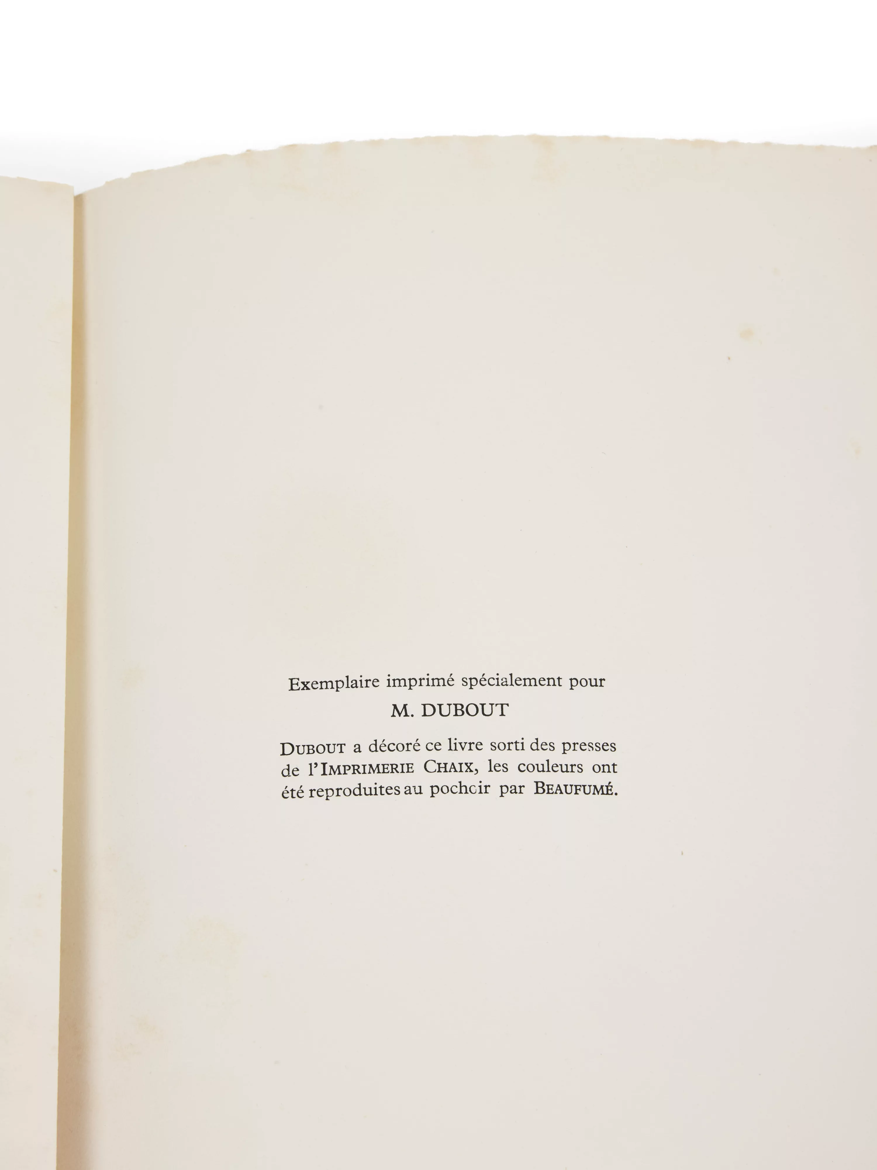 Première édition illustrée. 40 illustrations en couleurs, reproduites au pochoir par Beaufumé. Précieux exemplaire de l'artiste, imprimé à son attention. Envoi signé : « pour mon cher Albert Dubout, avec mon affection et mon admiration, son ami, Marcel Pagnol ».