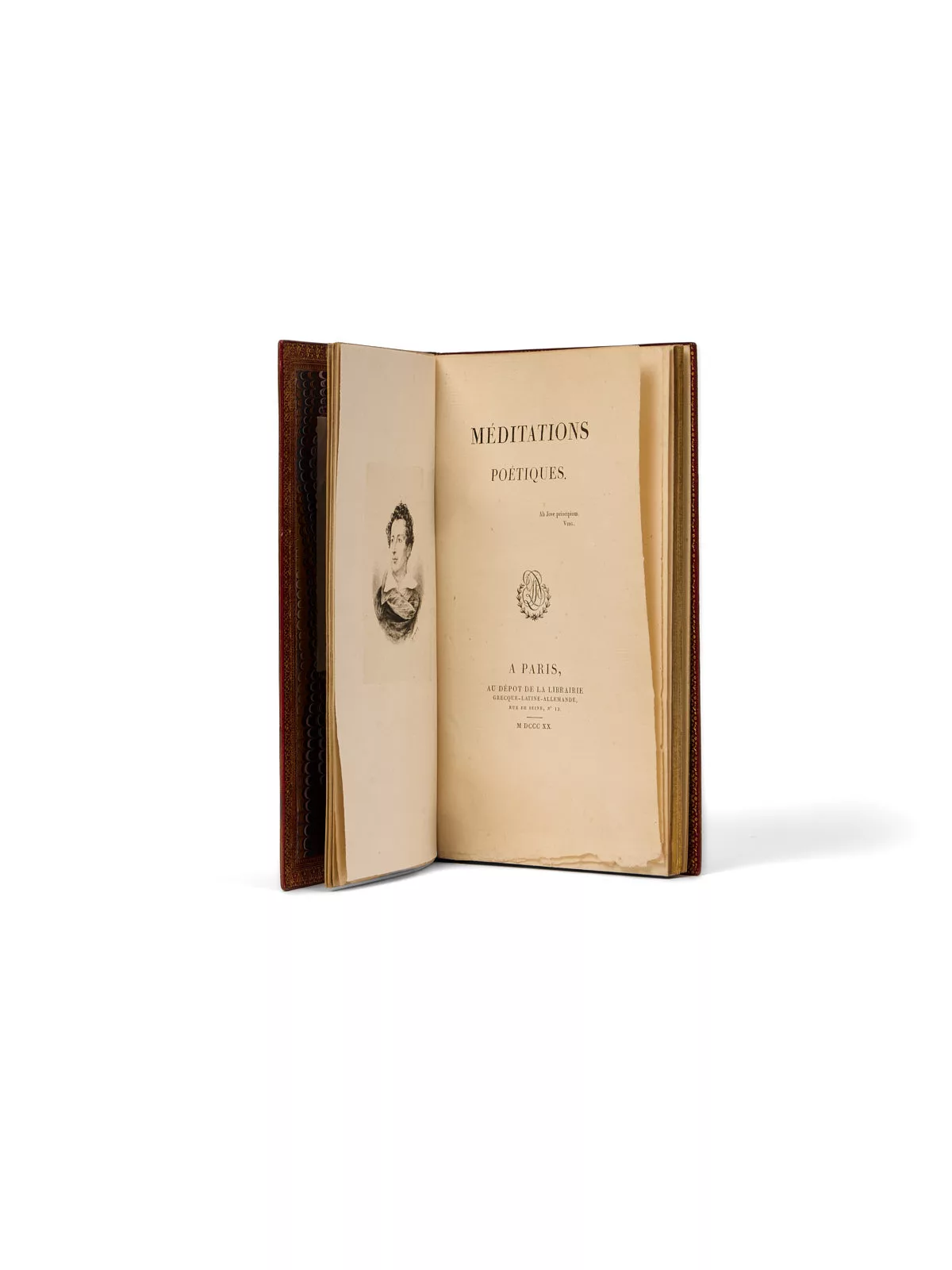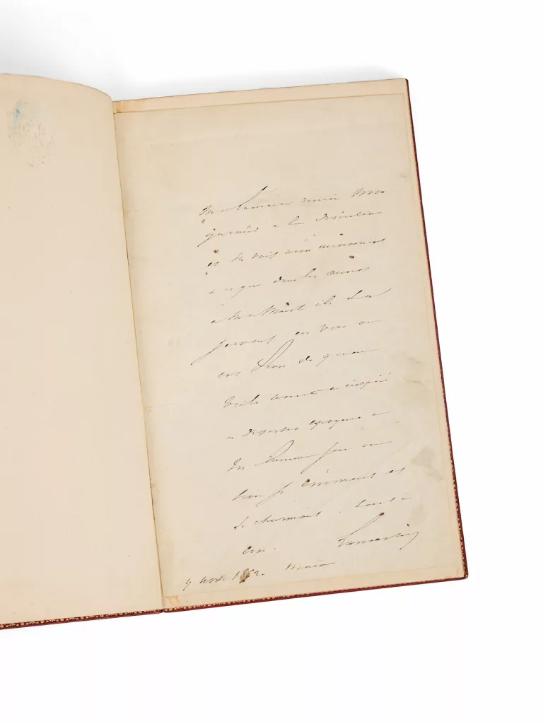 Ensemble, pour les années 1862 et 1863, ils signent leurs reliures du fer « Duru et Chambolle », précisant parfois, comme c’est le cas ici, l’année de réalisation de la reliure. Un portrait gravé de Lamartine a été ajouté en tête, ainsi qu’une lettre autographe signée, datée du 4 novembre 1862.