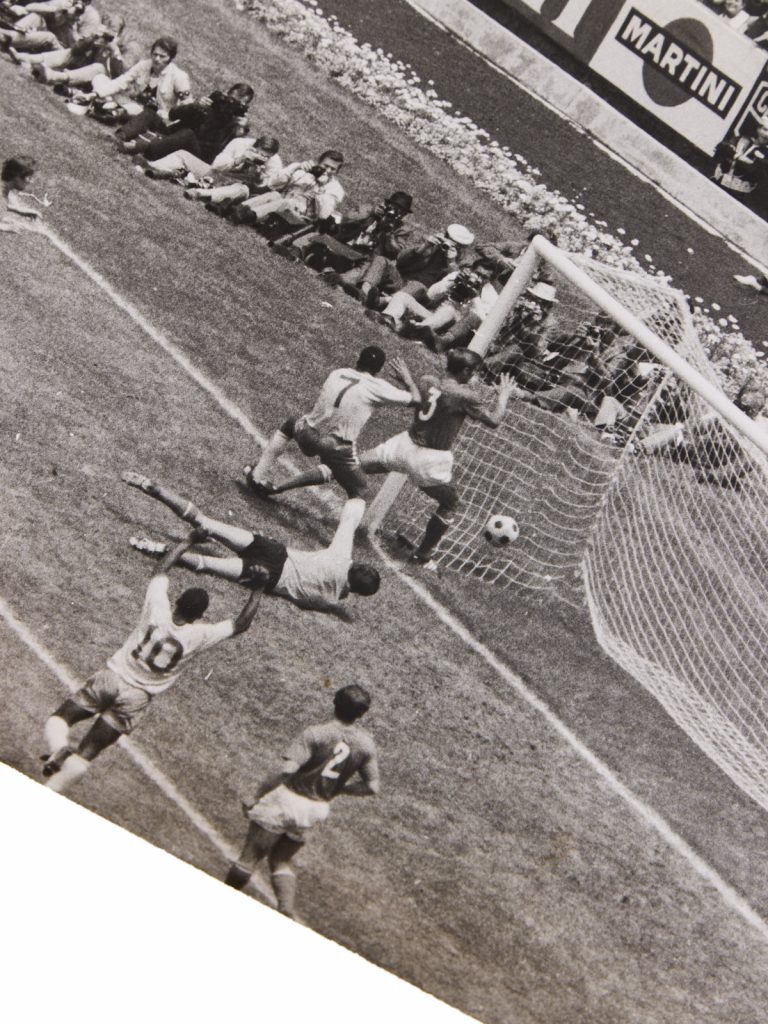Exemplaire enrichi de trois photographies (en tirages de presse d’époque) par Henri Besson, l’un des plus grands photographes sportifs. Il couvre en 1970 sa seule Coupe du monde, avant de se spécialiser dans le cyclisme : il devient chef du service photo de Miroir du cyclisme en 1971. Les clichés illustrent les deux passes décisives de Pelé : la remise de la tête et le but de Jairzinho et la passe en profondeur pour Carlos Alberto.