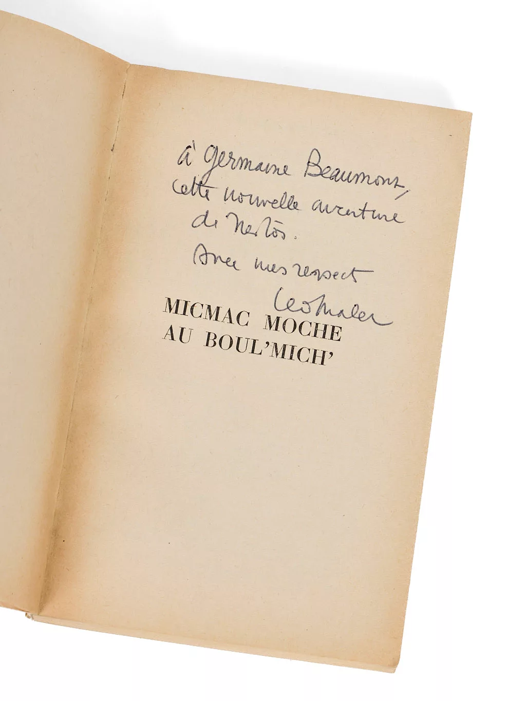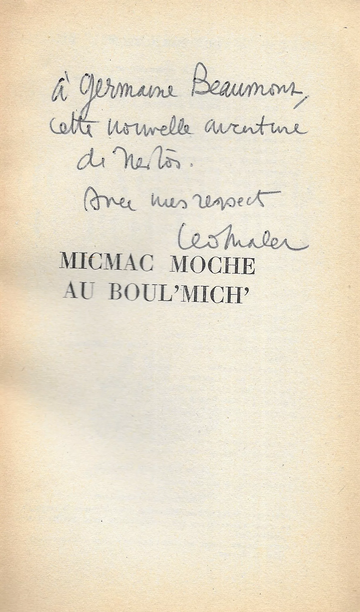 Rare édition, ici de bonne provenance : influencée par l’oeuvre de Colette ou Virginia Woolf, Germaine Beaumont est la première lauréate du prix Renaudot. Elle présida par la suite le Femina, où elle révéla notamment André Dhôtel pour Le Pays où l’on n’arrive jamais. Anglophone, on lui doit les traductions de grands livres, dont le Petit Déjeuner chez Tiffany de Truman Capote ou le Journal d’un écrivain de Virginia Woolf. Proche amie de Malet, elle se passionna pour l’univers des romans policiers, rédigeant entre 1966 et 1977 des articles de critique littéraire dans Mystère magazine où « elle prône un roman policier sortant de sa marginalité pour devenir roman à part entière ». Selon le mot de Colette, elle écrivait « des romans policiers sans policiers ».