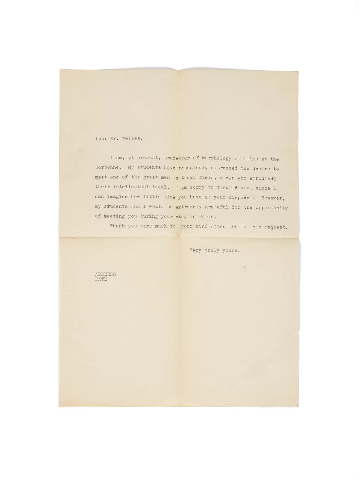– Une lettre dactylographiée, adressée à Orson Welles par un professeur de la Sorbonne qui sollicite le réalisateur pour une rencontre avec ses étudiants, à l’occasion du passage du cinéaste à Paris, en 1947. Welles vient de terminer le tournage de Macbeth aux États-Unis et, suivant la méthode rodée avec La Splendeur des Amberson, il choisit de monter le film à l’étranger – en l’occurrence à Paris. L’escapade est aussi fiscale et politique : Welles fuit l’IRS américain et les chasseurs de sorcières du maccarthysme déterminés à lui faire payer son soutien appuyé aux causes de gauche. Il restera vingt ans sans revoir les États-Unis.