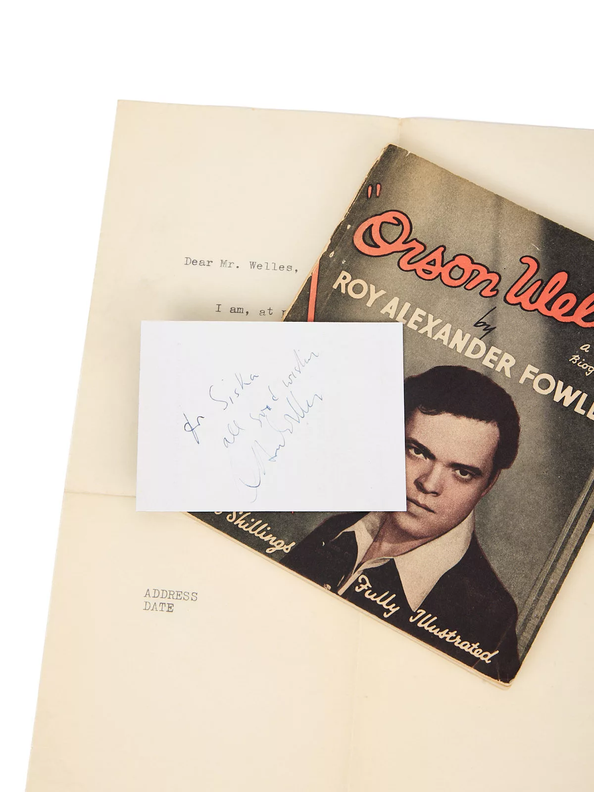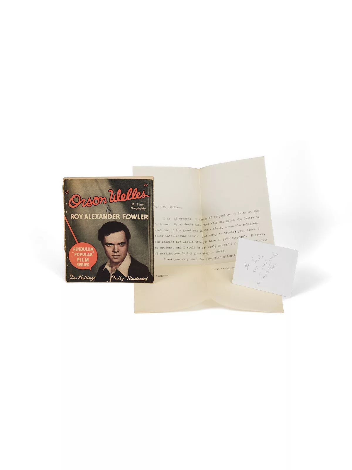 – L’édition originale de la première biographie consacrée à Orson Welles, par Roy Alexander Fowler et publiée à Londres par Pendulum, quelques semaines après la sortie de Citizen Kane à Paris, en juillet 1946, avec une reproduction photographique tirée du film.
