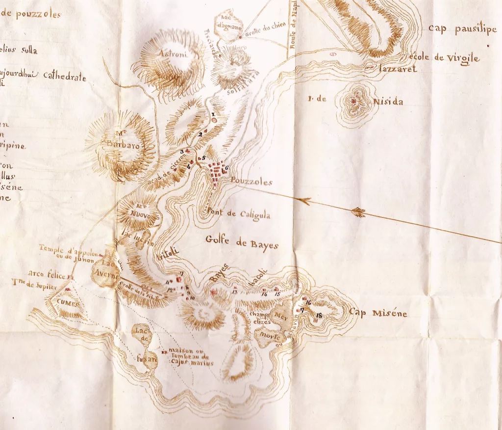 Manuscrit autographe de ce « journal italien », avec une carte du site de Pompéi et une carte de la baie de Naples, principalement la côte du Cap Pausilippe à Cumes.