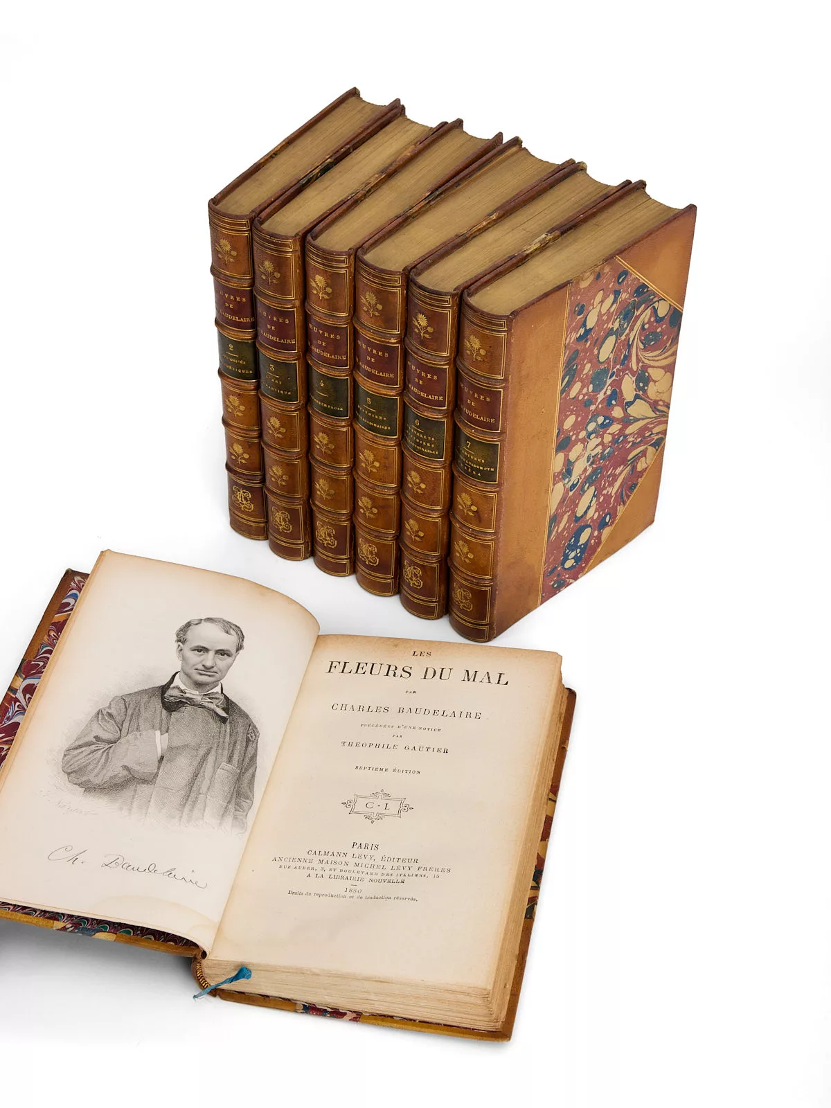 Réimpression de ces oeuvres complètes dont la première émission parut chez Michel Lévy à partir de 1868 : elle contenait alors plusieurs textes en éditions originales. La maison Michel Lévy détenait les droits de Baudelaire depuis 1863 et c’est son frère, Calmann, qui, après la mort de ce dernier en 1875, prendra la suite et les rênes de la maison d’édition. La collection – complète – comprend :