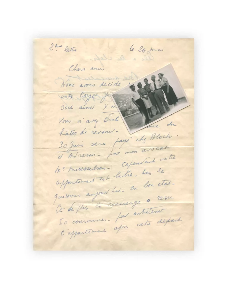 [Copenhague, Menton, 1948-1949].* Une lettre autographe signée (210 x 297 mm), recto-verso, sur le vergé jaune qu'employait Céline pendant l'exil, à l'encre bleue, écriture très lisible, datée Copenhague le 26 mai 1948 et signée « L.F. Destouches » : « Chers amis, Nous avons décidé de payer encore votre loyer jusqu'au 30 septembre soit ainsi 4 mois…2 500 €