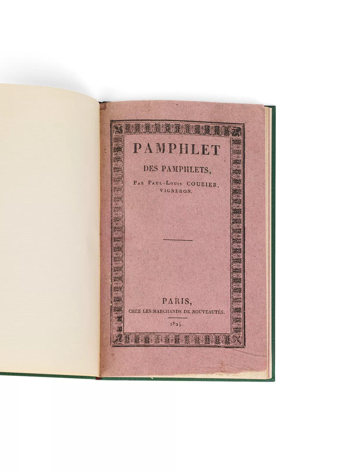 Officier d’artillerie sous la Révolution puis sous l’Empire, Paul-Louis Courier préférait aux canons l’étude du grec et la lecture : son esprit d’insubordination le pousse à s’installer finalement comme vigneron dans sa Touraine natale où il étudia et traduisit les auteurs grecs ; surtout, en styliste impeccable il se mit à écrire ses pamphlets, petits chefs-d’oeuvre d’éloquence aux formules incisives. Sa verve, très appréciée de Mérimée et de Stendhal, le fit comparer de son vivant à Voltaire et à l’auteur des Provinciales. Le Pamphlet des pamphlets est sans doute le plus virulent, où il entendait démontrer l’utilité de la chose pamphlétaire, comme Pierre Larousse la définira plus tard à son sujet : « Le Pamphlet des pamphlets est un morceau irrésistible et dont le style, d’un bout à l’autre en harmonie avec le mouvement de l’inspiration la plus capricieuse et la plus hardie, est peut-être ce que l’on peut citer dans notre langue de plus achevé comme goût et de plus merveilleux comme art ».