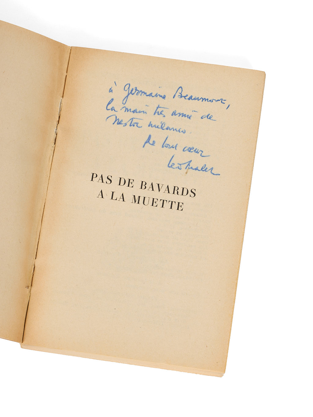 Rare édition, ici de bonne provenance : influencée par l’oeuvre de Colette et de Virginia Woolf, Germaine Beaumont est la première lauréate du prix Renaudot. Elle présida par la suite le Femina, où elle révéla notamment André Dhôtel avec Le Pays où l’on n’arrive jamais. Anglophone, on lui doit les traductions de grands livres, dont Petit Déjeuner chez Tiffany de Truman Capote et Journal d’un écrivain de Virginia Woolf. Proche amie de Malet, elle se passionna pour l’univers des romans policiers, rédigeant entre 1966 et 1977 des articles de critique littéraire dans Mystère magazine où « elle prône un roman policier sortant de sa marginalité pour devenir roman à part entière ». Selon le mot de Colette, elle écrivait « des romans policiers sans policiers ».