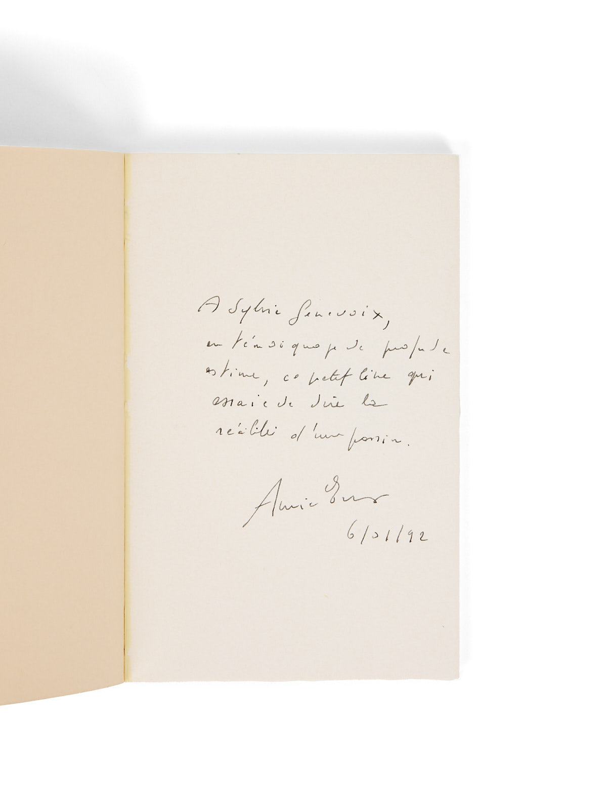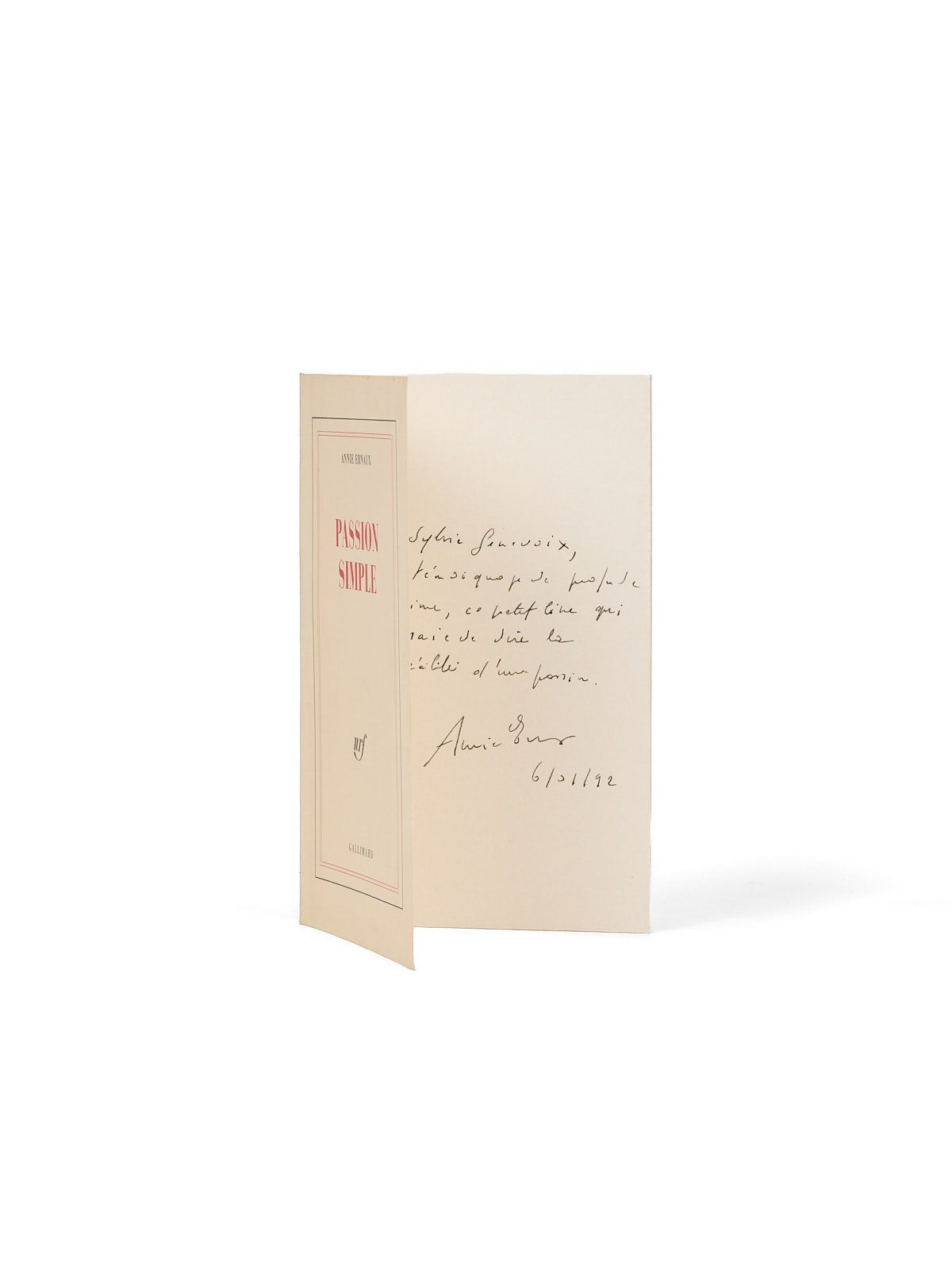 Envoi signé : « À Sylvie Genevoix, en témoignage de profonde estime, ce petit livre qui essaie de dire la réalité d'une passion. Annie Ernaux. 6/01/92 ».