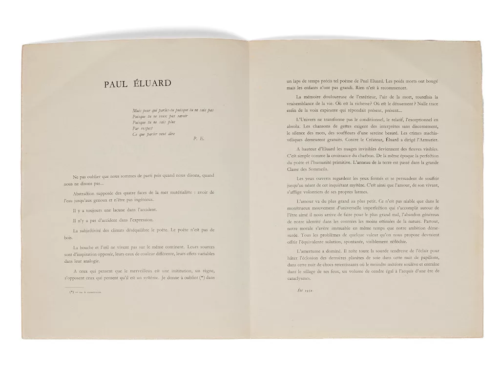 Après Ralentir travaux en 1930 écrit avec André Breton, Char signera deux livres avec Éluard : Rêves d’encre (Corti, 1945) et Deux poèmes (Jean Hugues, 1960).