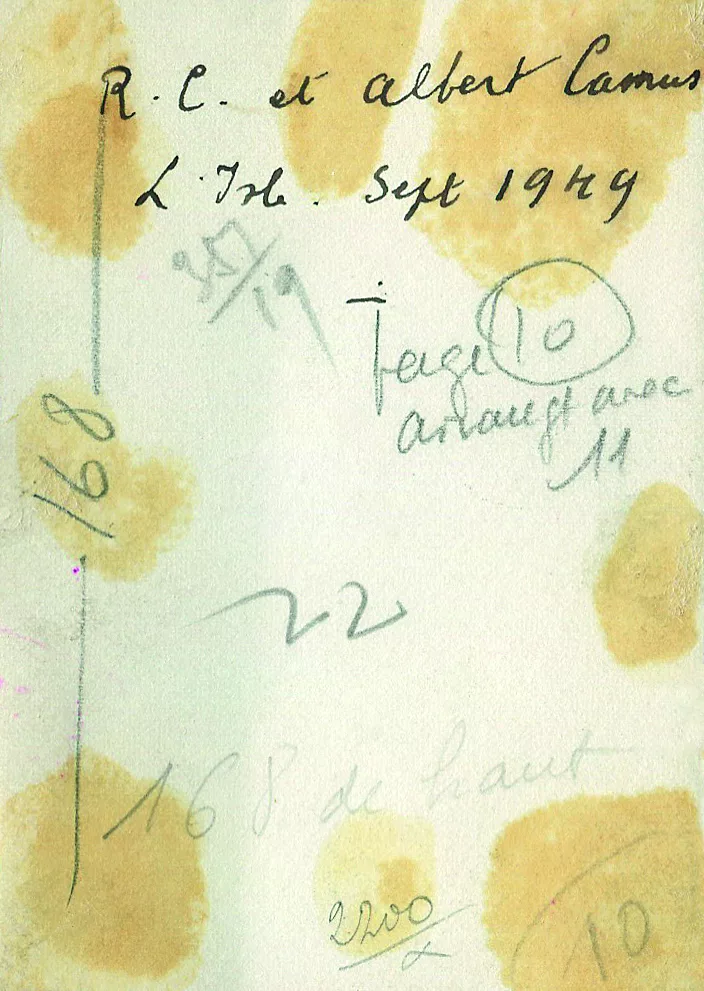 Note autographe au verso : " R.C. et Albert Camus / L'Isle. Sept. 1949", de la main de René Char.