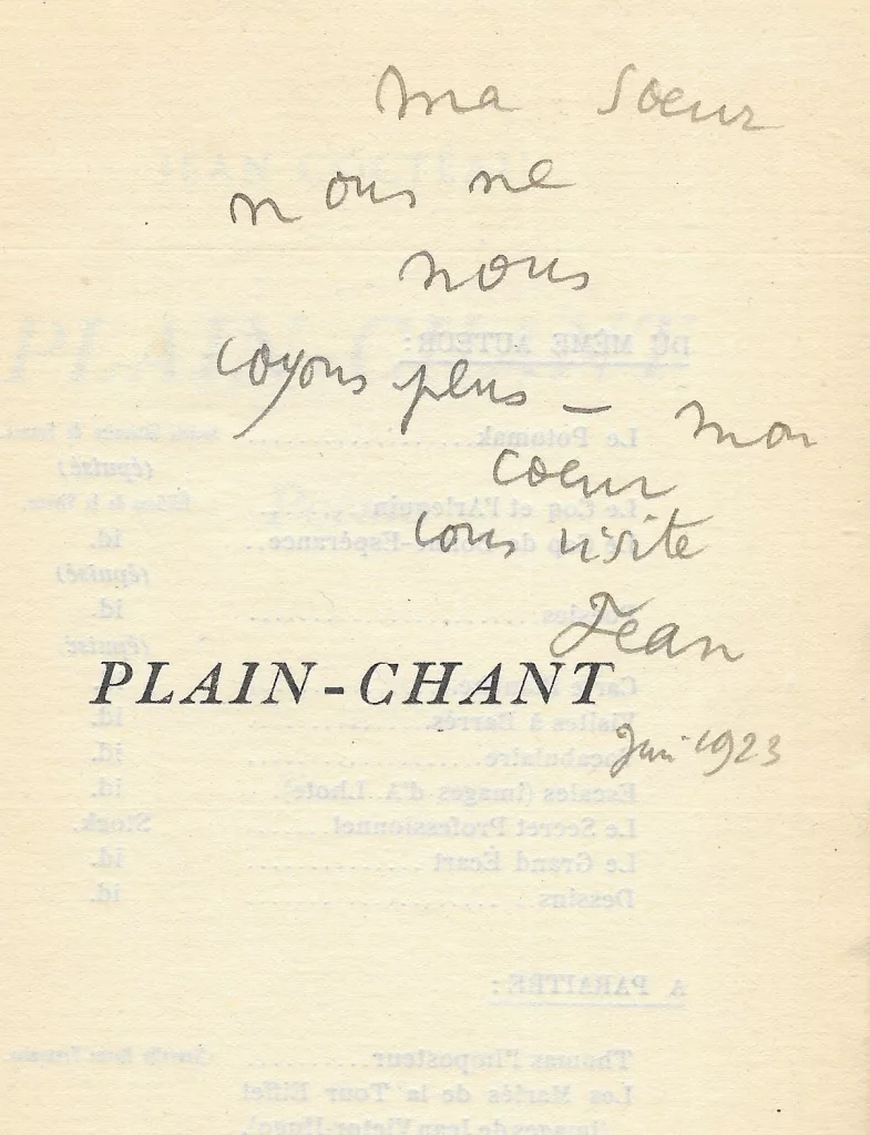 Envoi signé : « Ma sœur, nous ne nous voyons plus – mon cœur vous visite, Jean, juin 1923 ».