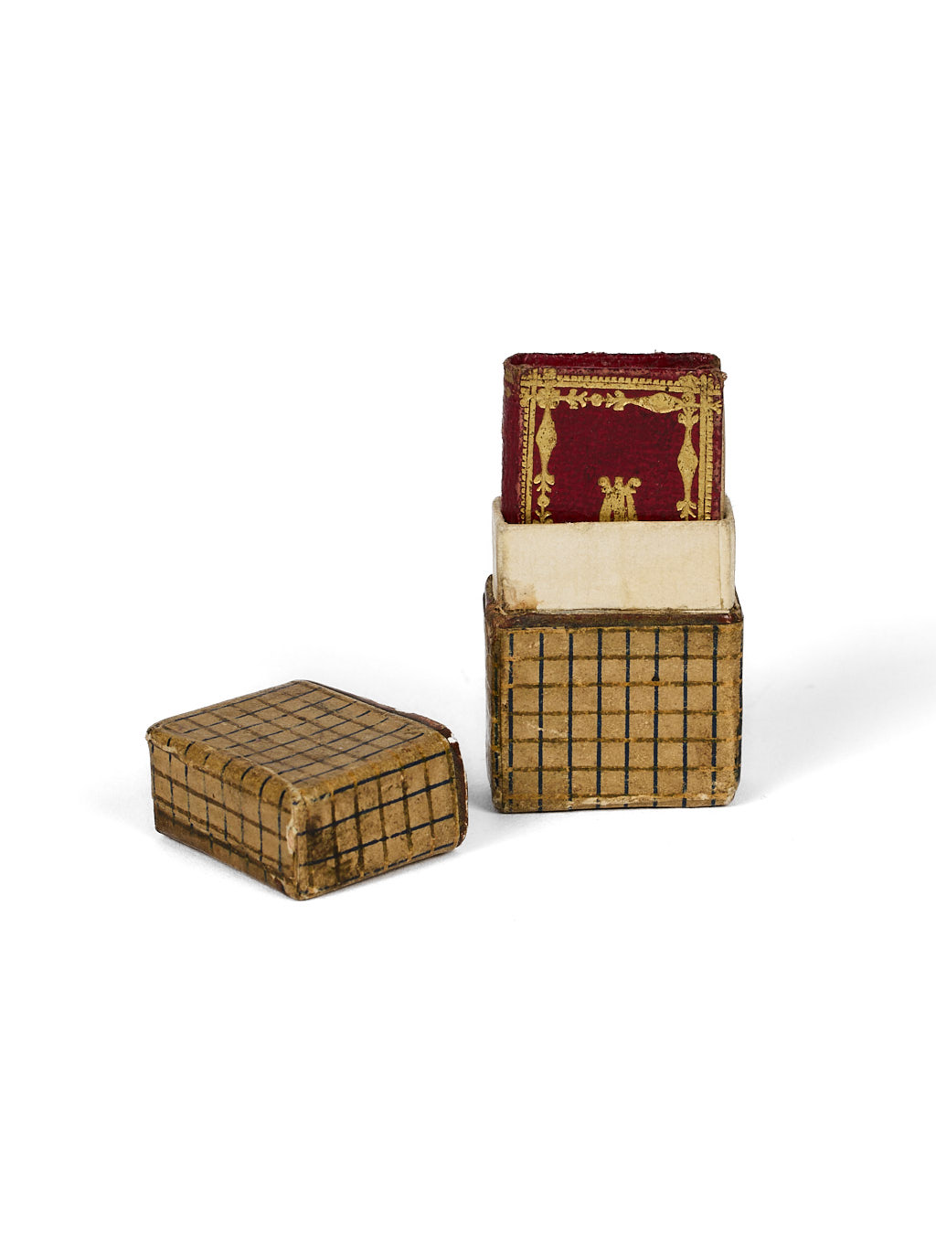1 vol. (20 x 27 mm) de 64 p. Maroquin rouge, dos lisse orné, roulettes et filet encadrant les plats, motif doré au centre, tranches dorées, étui cigare (reliure de l'époque).