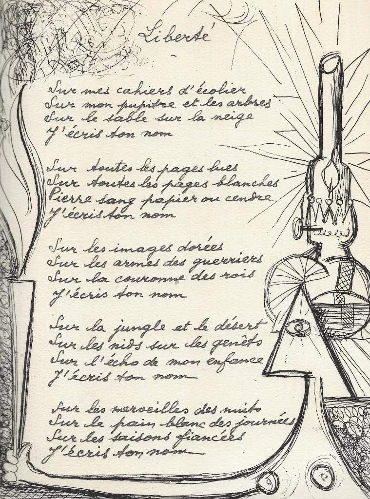 Frontispice en couleurs, à l’eau-forte, par Oscar Dominguez, 1 vignette gravée en couverture et 31 eaux-fortes à pleine page avec les poèmes autographes de Paul Éluard reproduits en fac-similé.