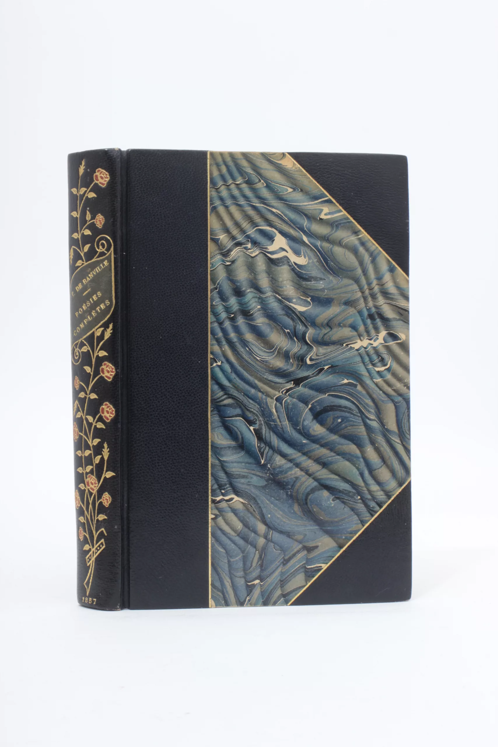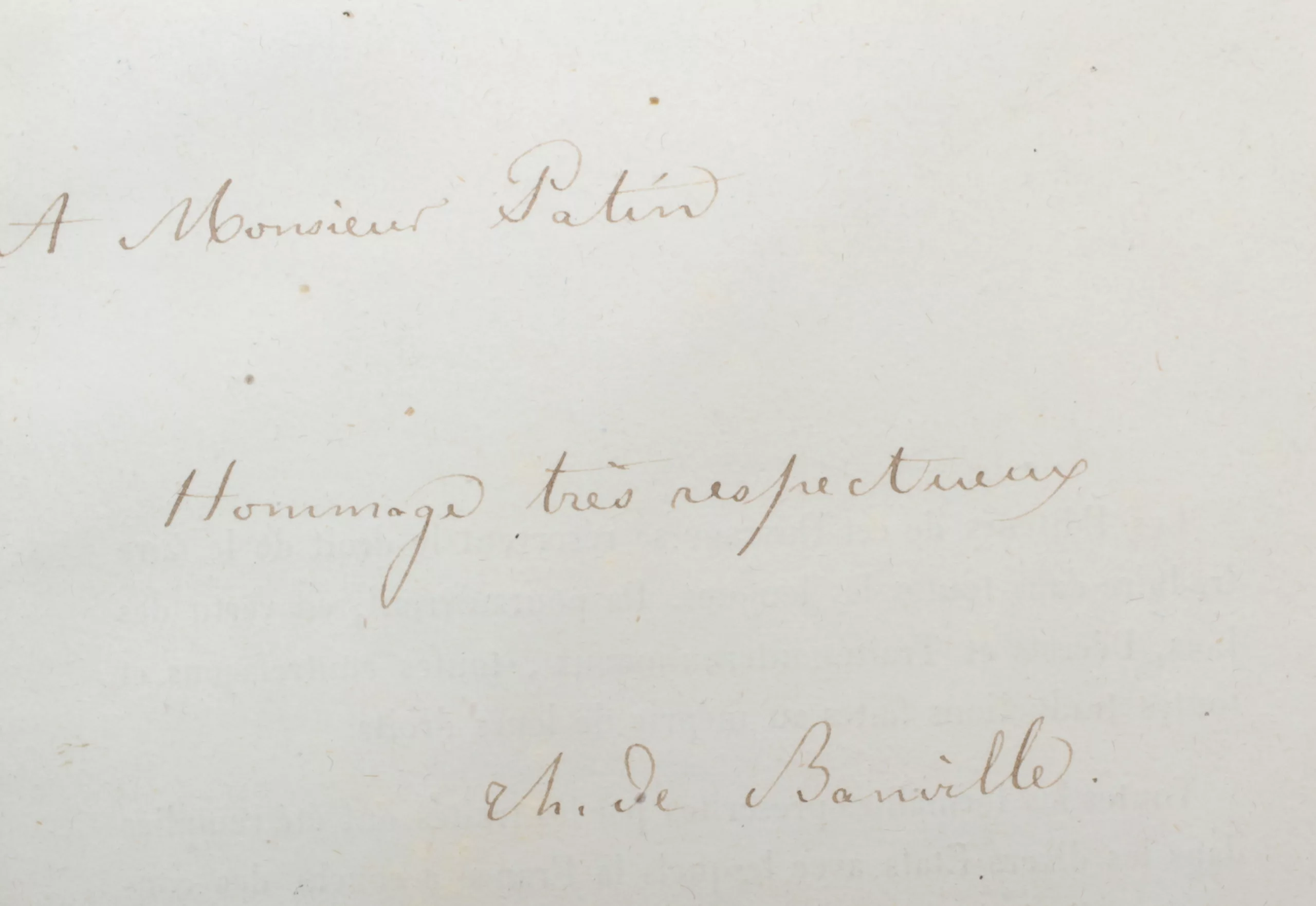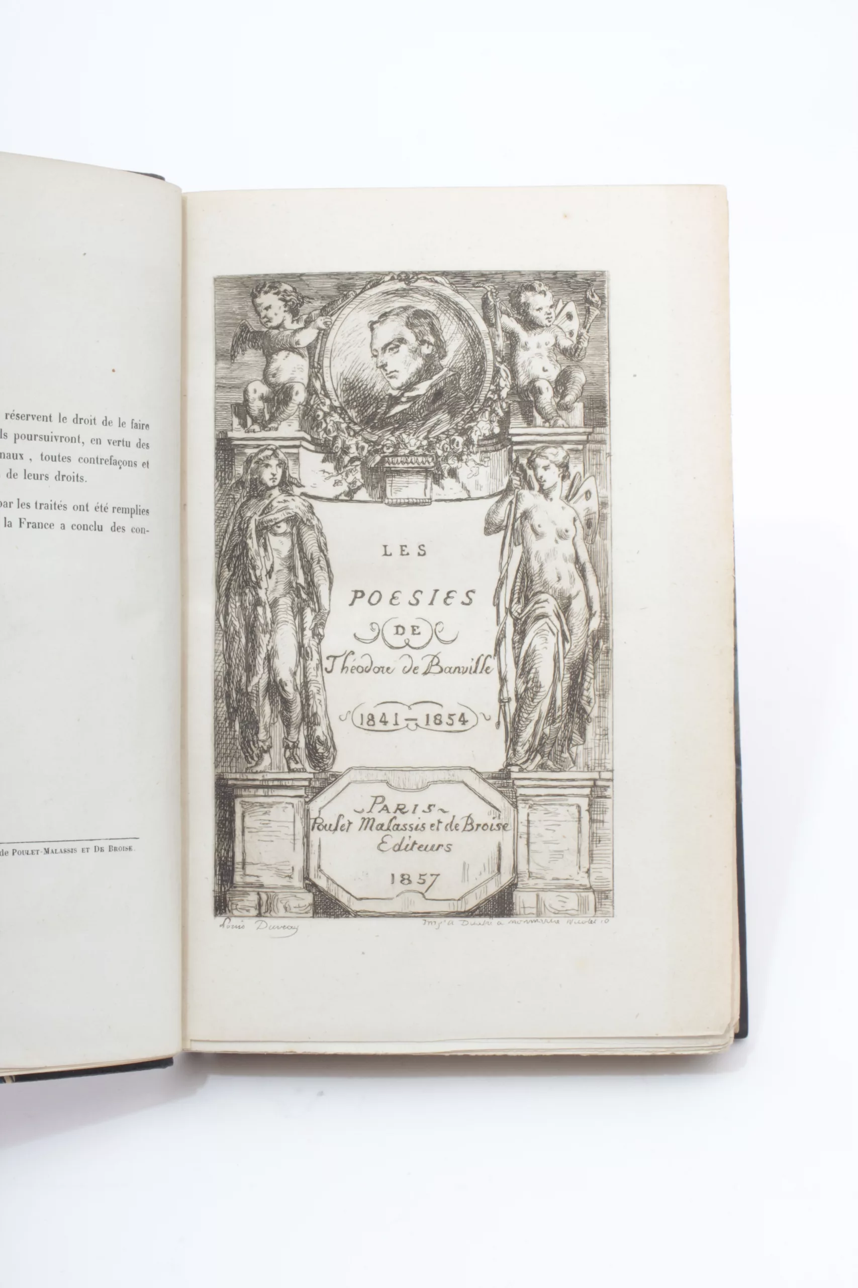 Première édition collective, en partie originale et premier tirage. Titre gravé par Louis Duveau. Envoi signé : "À Monsieur Patin, hommage très respectueux, Th. de Banville". " D'importantes pièces paraissent ici en édition originale le recueil intitulé Le Sang de la coupe. Les Stalactites sont augmentées de 2 poèmes. Les Cariatides aussi sont transformées et augmentées " Oberlé). De la bibliothèque Albert Natural (ex-libris).
