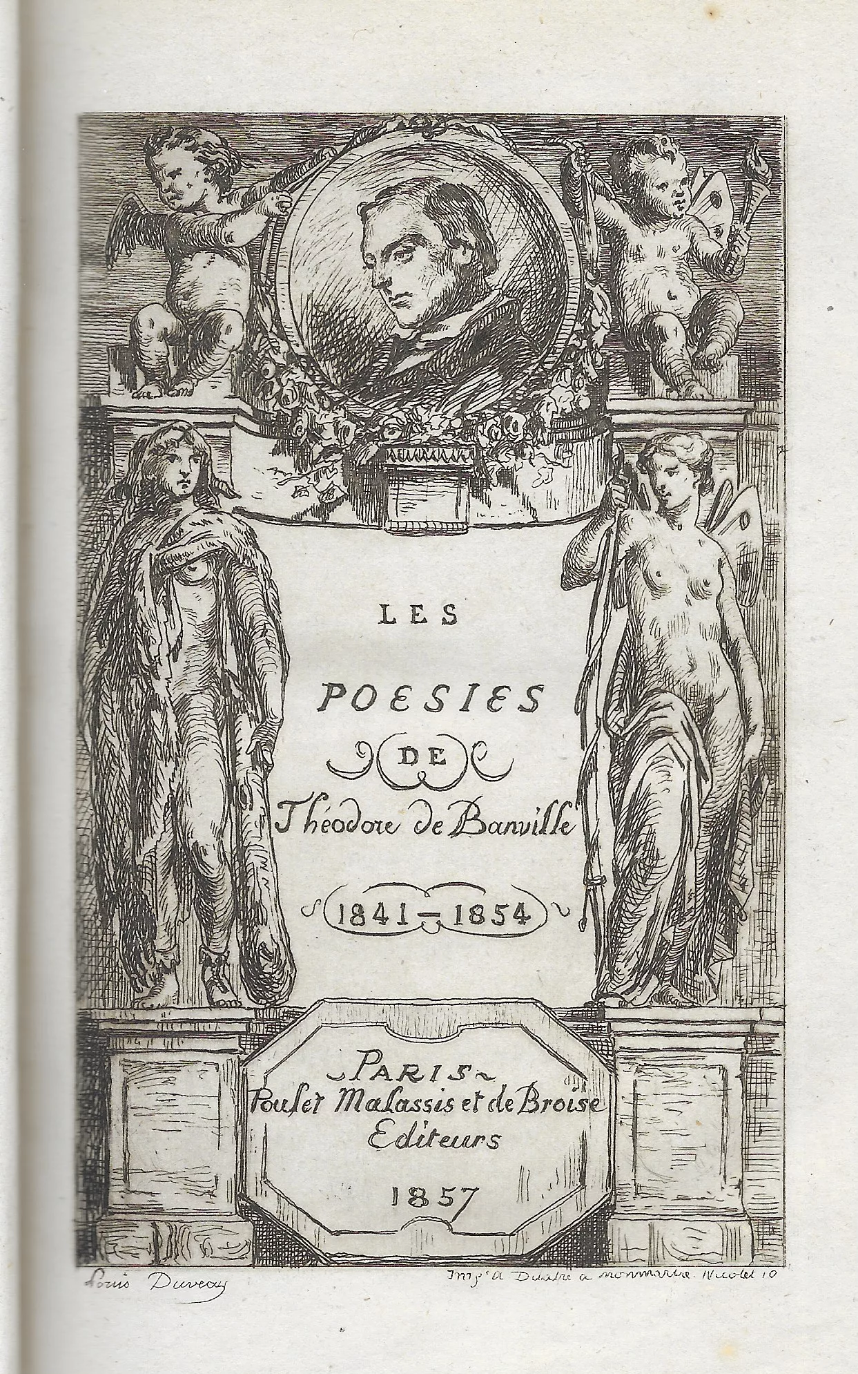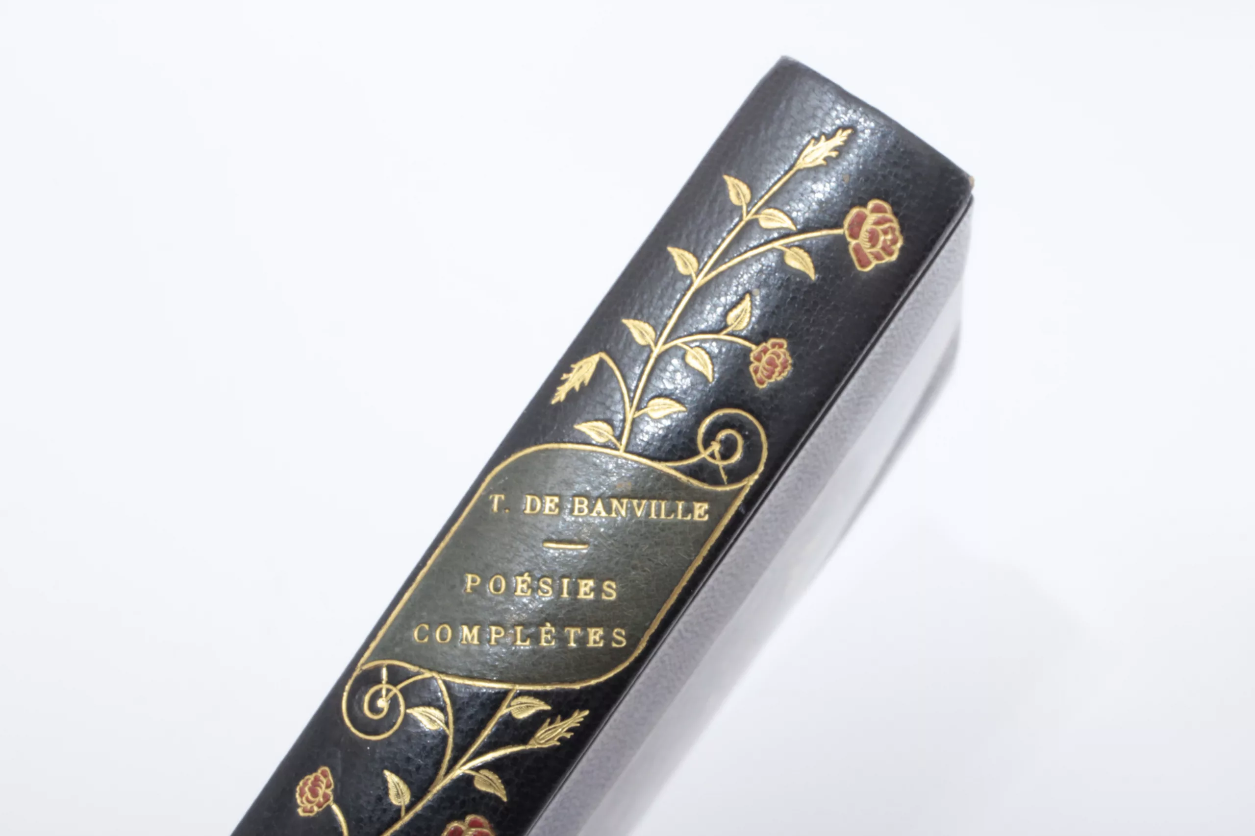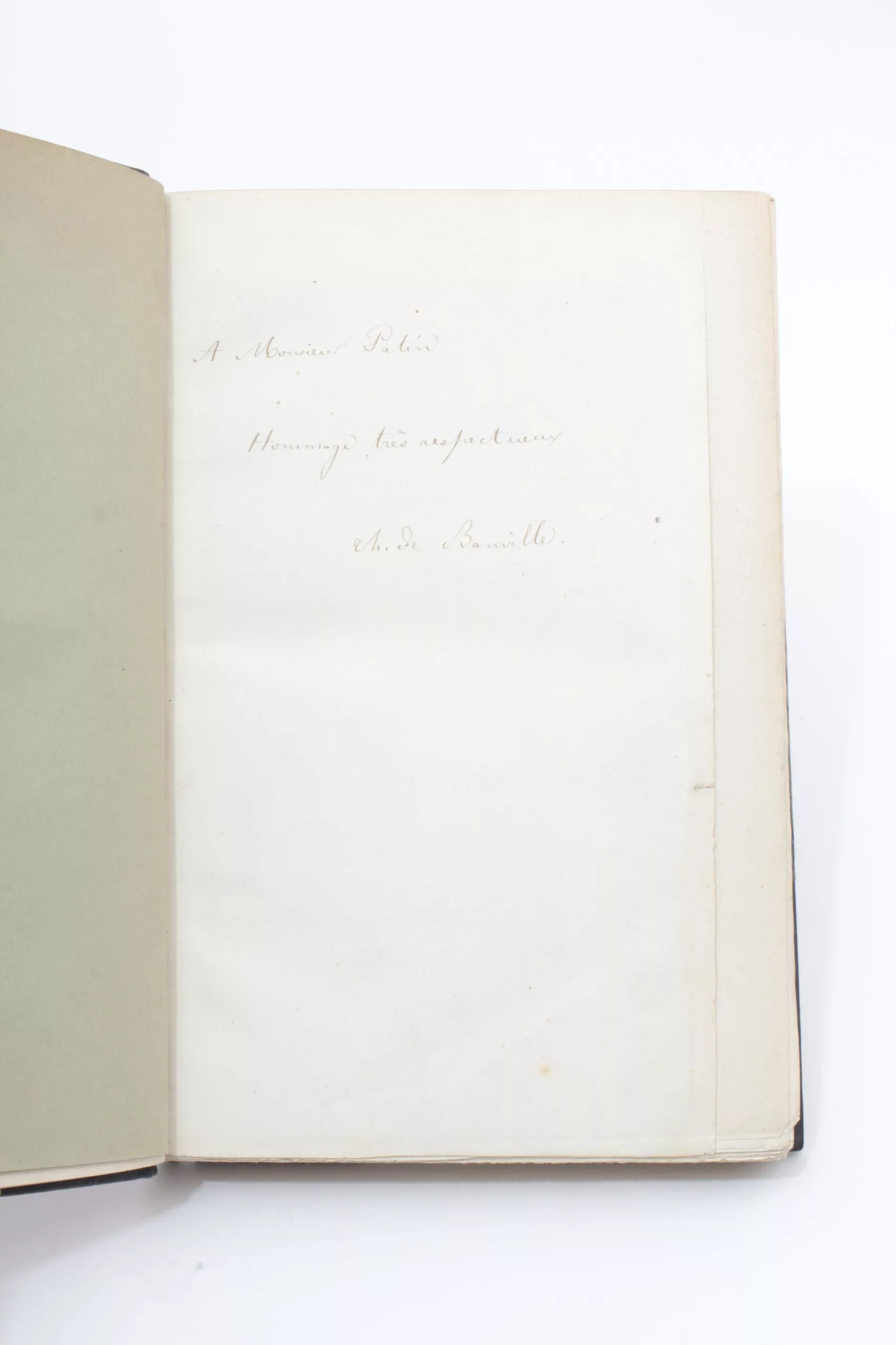 Première édition collective, en partie originale et premier tirage. Titre gravé par Louis Duveau. Envoi signé : "À Monsieur Patin, hommage très respectueux, Th. de Banville". " D'importantes pièces paraissent ici en édition originale le recueil intitulé Le Sang de la coupe. Les Stalactites sont augmentées de 2 poèmes. Les Cariatides aussi sont transformées et augmentées " Oberlé). De la bibliothèque Albert Natural (ex-libris).