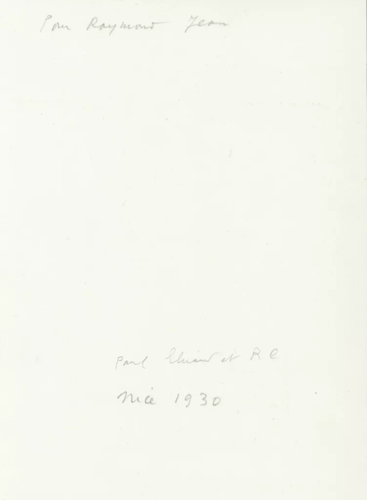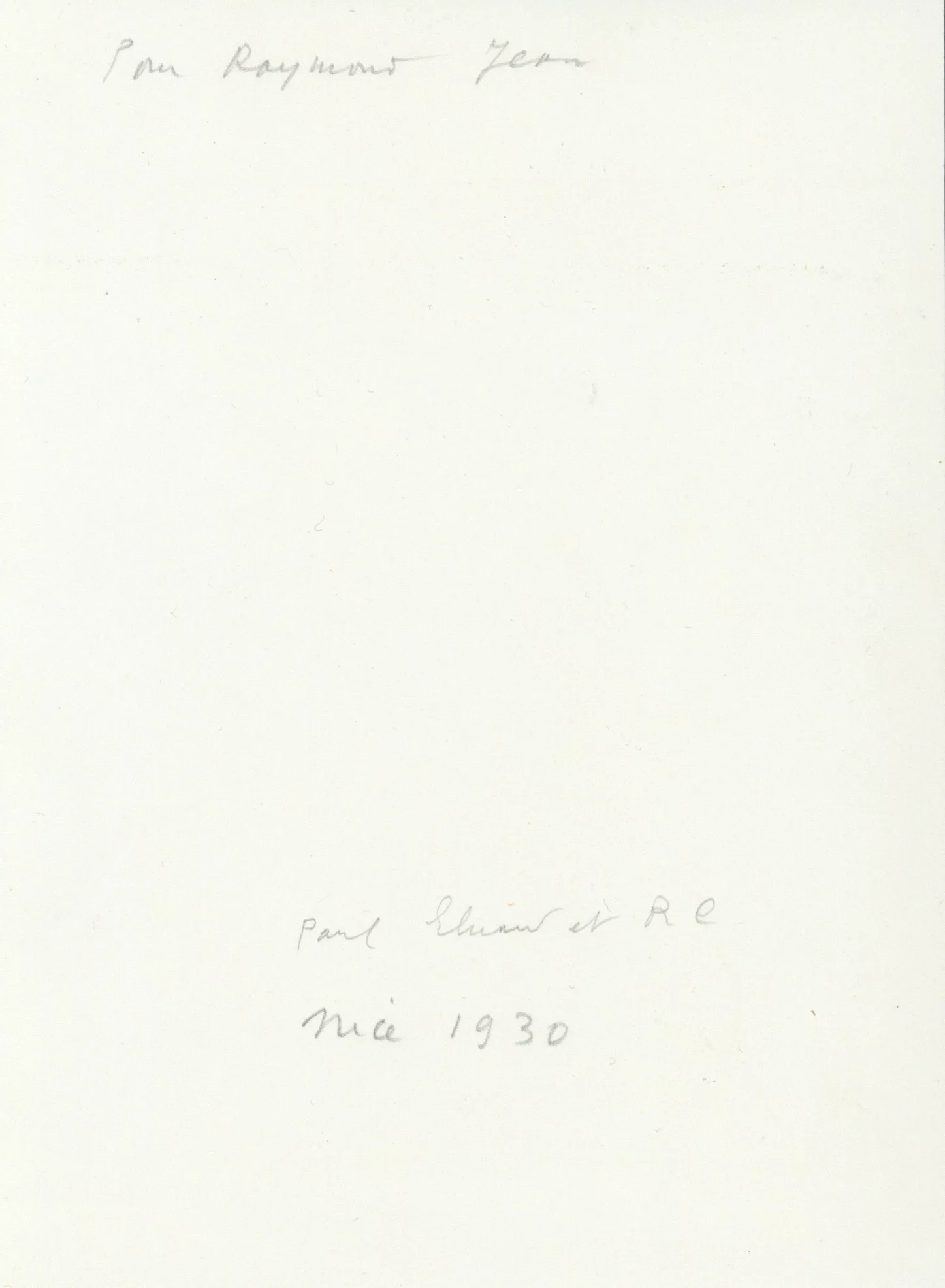Ce tirage est offet par René Char : « Pour Raymond Jean » et légendée par lui « Paul Éluard et RC / Nice 1930 ».