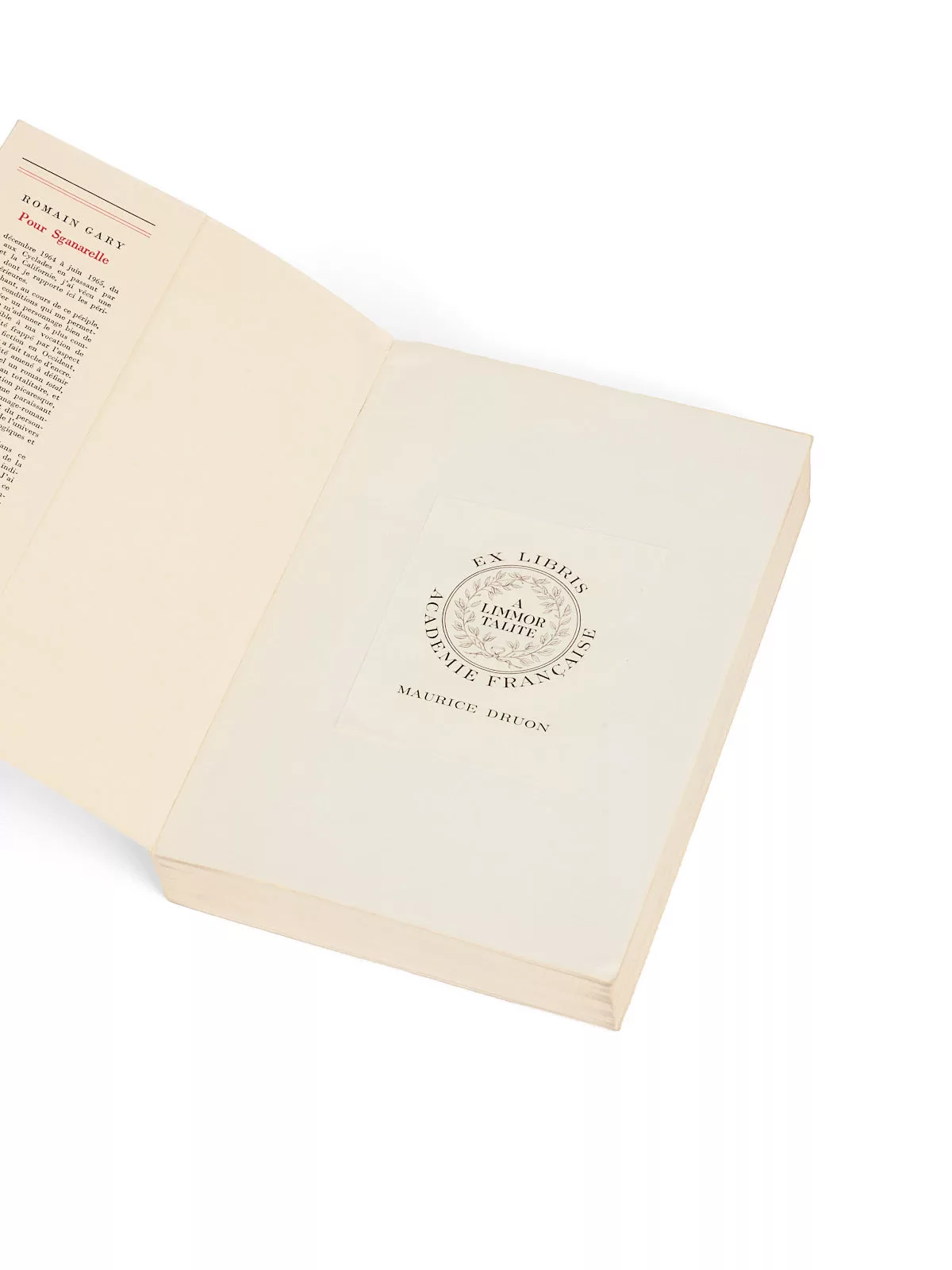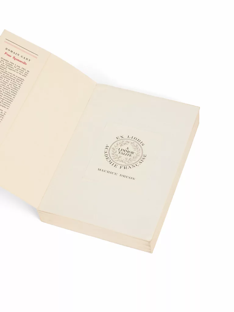 L’amitié et le respect mutuel de Romain Gary avec Joseph Kessel pouvait difficilement faire autrement que de rendre possible une rencontre entre Gary et Maurice Druon. La bibliothèque de ce dernier contenait une partie des titres publiés par Gary entre 1965 – Pour Sganarelle formant le premier d’entre eux – jusqu’en 1977, avec Clair de femme.