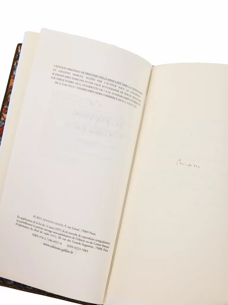 Un des 20 premiers exemplaires enrichis d'une page autographe de l'auteur, signé par Quignard (n° 6).
