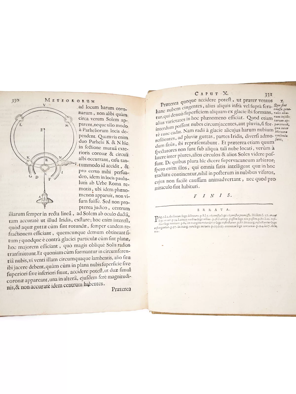 De nombreuses figures sur bois, illustrant ses travaux sur la réfraction de la lumière, la vision et les phénomènes de l’arc-en-ciel et des vents, accompagnent le texte de la Dioptrique et des Météores, où Descartes explique les mouvements des astres dans le système solaire par l’intervention de forces, en supposant que chacun des astres est entouré d’un tourbillon de matière subtile qui l’entraîne. C’est la première édition du système de physique de Descartes, dans laquelle il développe sa théorie des vortex, point de départ de tous les travaux sérieux en théorie physique au milieu du XVIIe siècle, y compris celui de Newton.