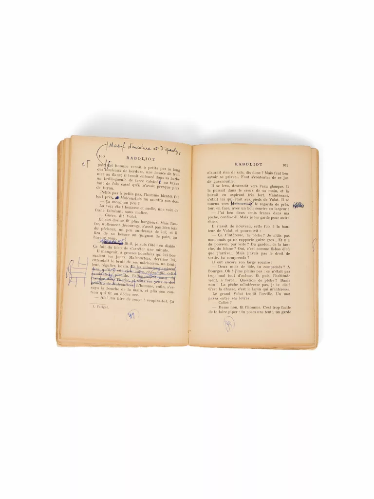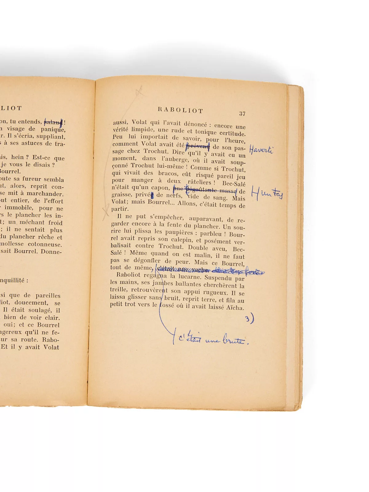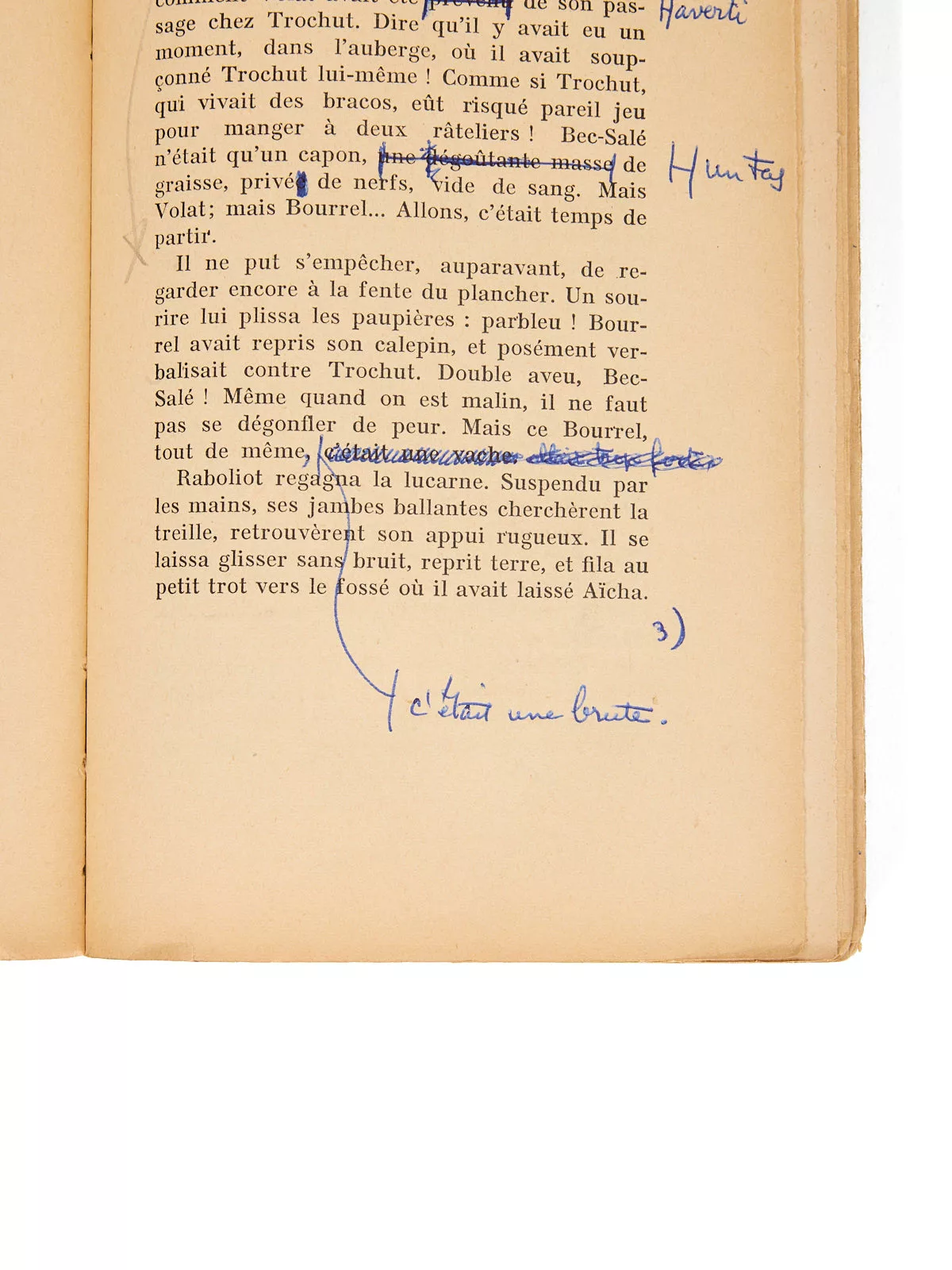 Le volume comporte en tête cette note autographe : « Exemplaire revu pour la lecture au micro. Il faudra reporter les suppressions (en remaniant) sur un autre exemplaire destiné à l'édition illustrée Delagrave. Là, peut-être, retenir certaines de ces modifications (bien moindres), en prévision d'une nouvelle édition Grasset ».