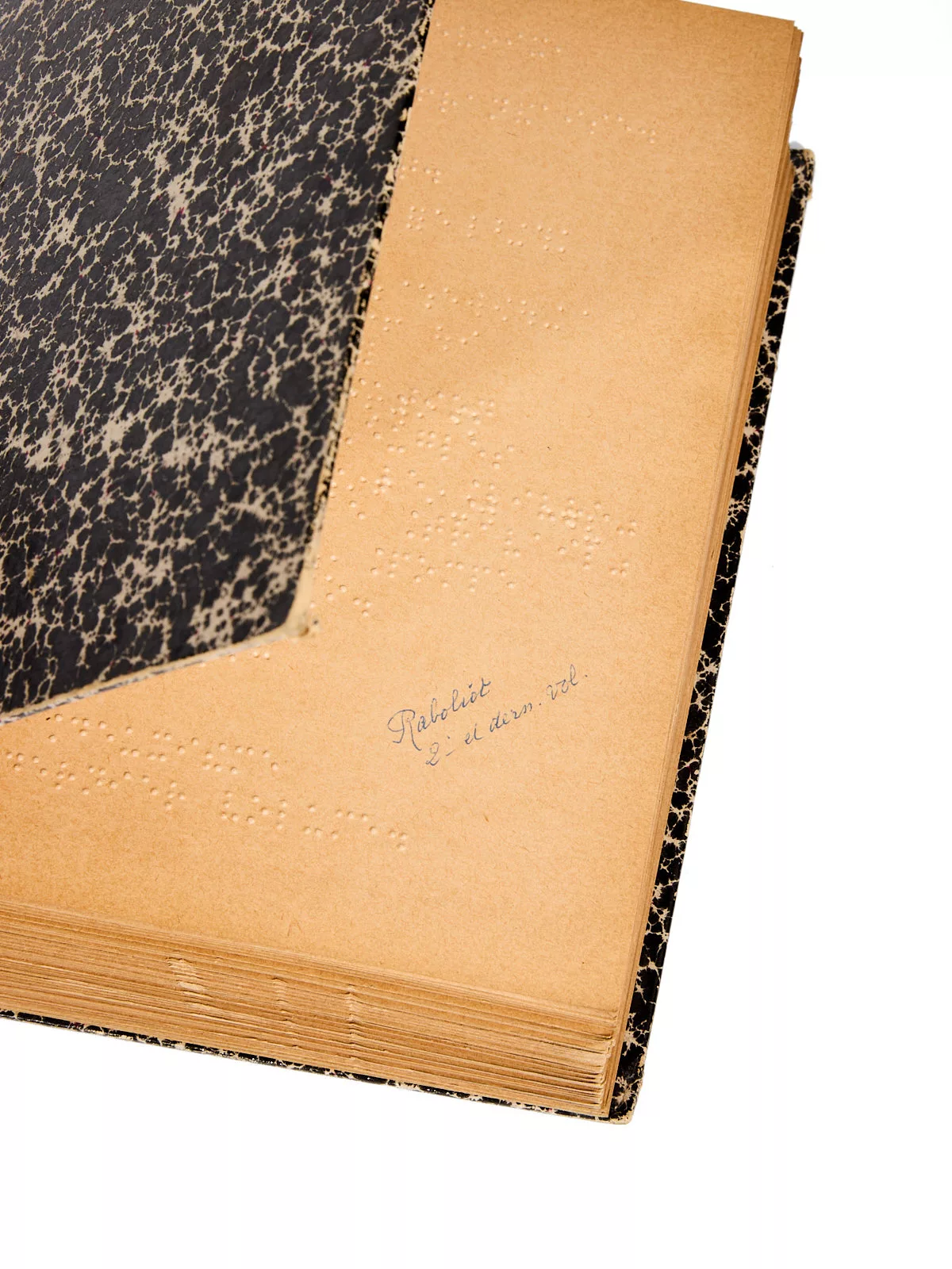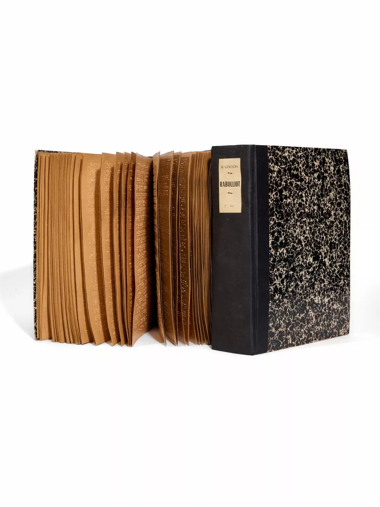 Rare édition de Raboliot, embossée, destinée à la seule lecture tactile en braille : aucun texte visible à l’encre n’est présent, hormis le titrage au dos des volumes. Non commerciale, elle est réalisée à l’initiative de l’Association pour les Aveugles, fondée en 1917 par Mme Chambet‑Chenault, qui a pour objet la prise en charge et la réinsertion des personnes aveugles. Un centre de rééducation pour aveugles récents est créé en 1963 au Domaine des Ombrages, à Marly-le-Roi : un établissement national et pionnier puisque c’est la première structure de ce type en France pour l’accompagnement des personnes devenant déficientes visuelles à l’âge adulte.
