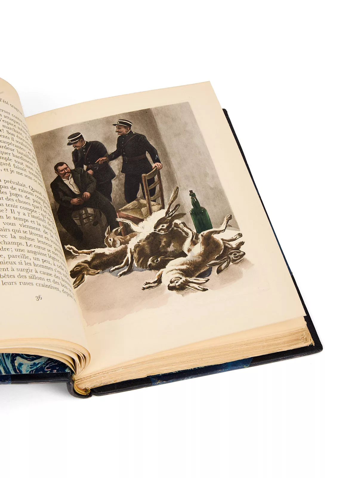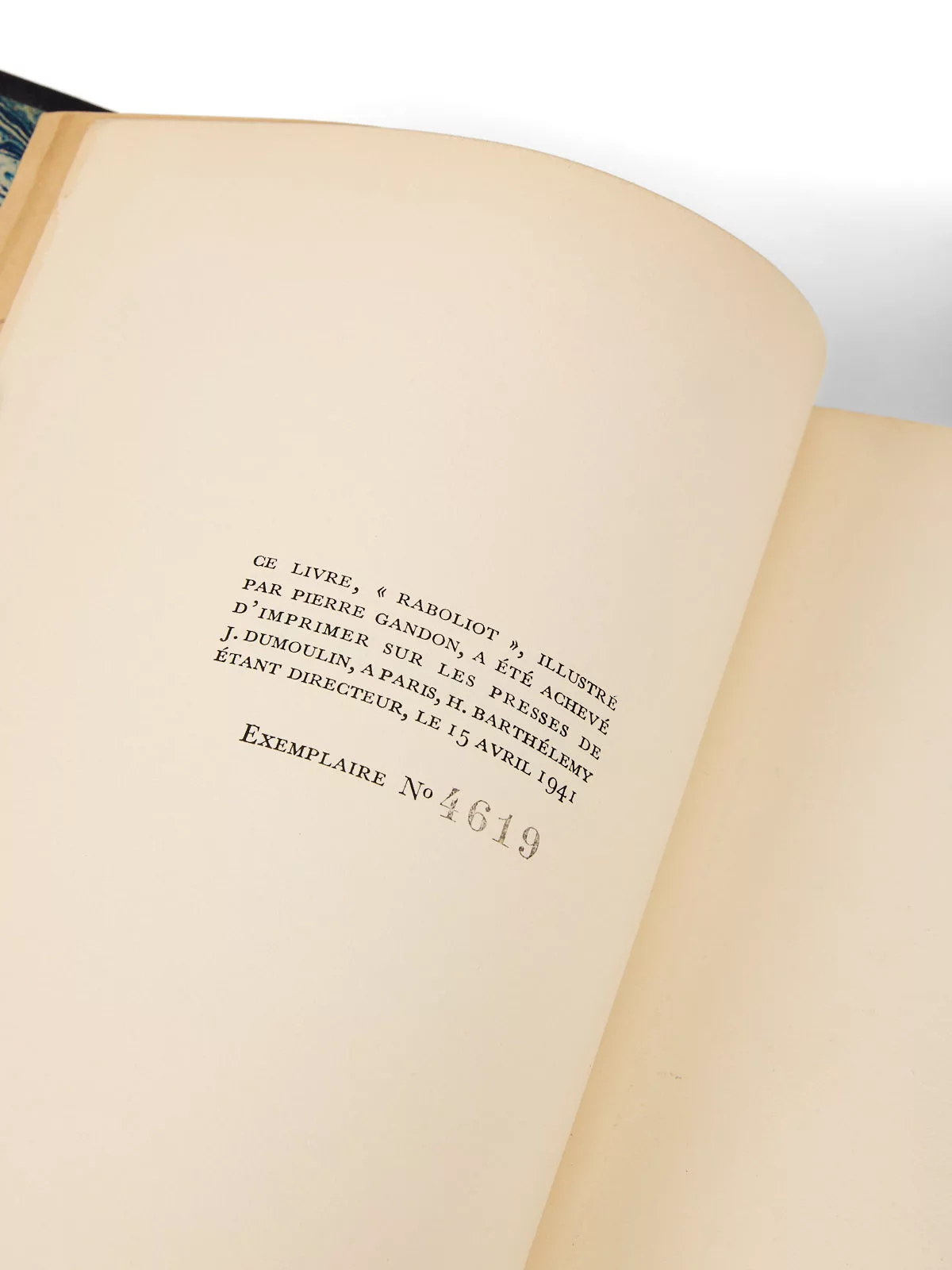 C’est la cinquième édition illustrée de Raboliot, celle-ci est publiée par les Éditions Rombaldi, fondées en 1932 par Toussaint Rombaldi et spécialisées dans la réédition de textes classiques ou contemporains dans un esprit bibliophilique, avec le concours d’artistes de renom (Chimot, Lobel-Riche, Chahine, Marquet,…). Les illustrations sont dues à Pierre Gandon (1899-1990), élève de l’École Estienne, formé à la gravure par Antoine Dezarrois (également maître d’Albert Decaris), puis admis aux Beaux-Arts de Paris. Il obtient à 22 ans le Grand Prix de Rome de gravure, puis en 1926, le Prix de la Ville de Paris.