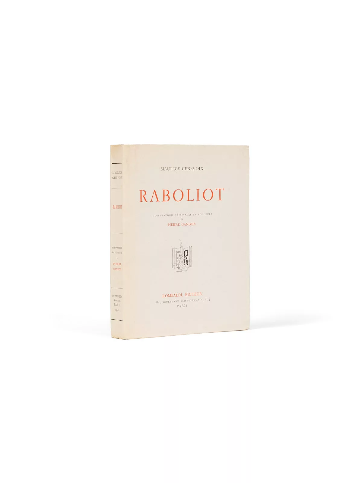C’est la cinquième édition illustrée de Raboliot, celle-ci est publiée par les Éditions Rombaldi, fondées en 1932 par Toussaint Rombaldi et spécialisées dans la réédition de textes classiques ou contemporains dans un esprit bibliophilique, avec le concours d’artistes de renom (Chimot, Lobel-Riche, Chahine, Marquet,…). Les illustrations sont dues à Pierre Gandon (1899-1990), élève de l’École Estienne, formé à la gravure par Antoine Dezarrois (également maître d’Albert Decaris), puis admis aux Beaux-Arts de Paris. Il obtient à 22 ans le Grand Prix de Rome de gravure, puis en 1926, le Prix de la Ville de Paris.