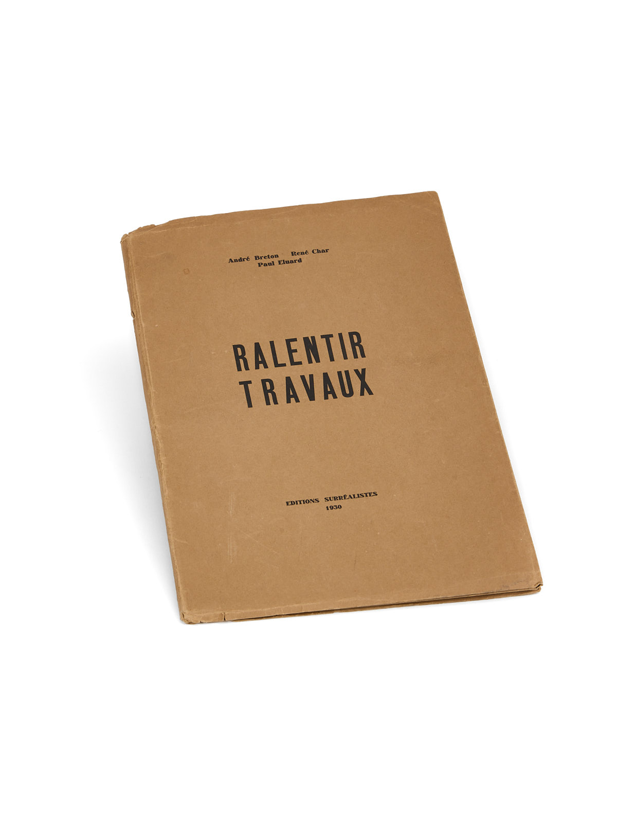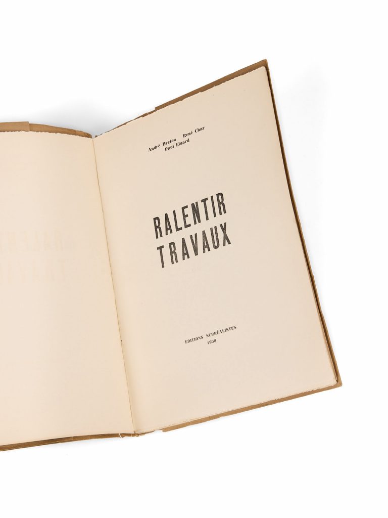 D’Avignon, en avril 1930, Paul Éluard écrit à Gala : « Nous avons fait, Breton, Char et moi un assez long livre de trente très beaux poèmes que l’imprimeur de Char nous fait pour rien à 200 exemplaires ». Cet imprimeur, c’est José Corti, qui relate l’époque de la création de Ralentir Travaux dans Provisoirement définitif : « […] ce furent des semaines de ferveur poétique » qui aboutiront à l’une des illustrations les plus lumineuses de la volonté de « mise en commun » de la pensée et des axes majeurs du projet surréaliste.